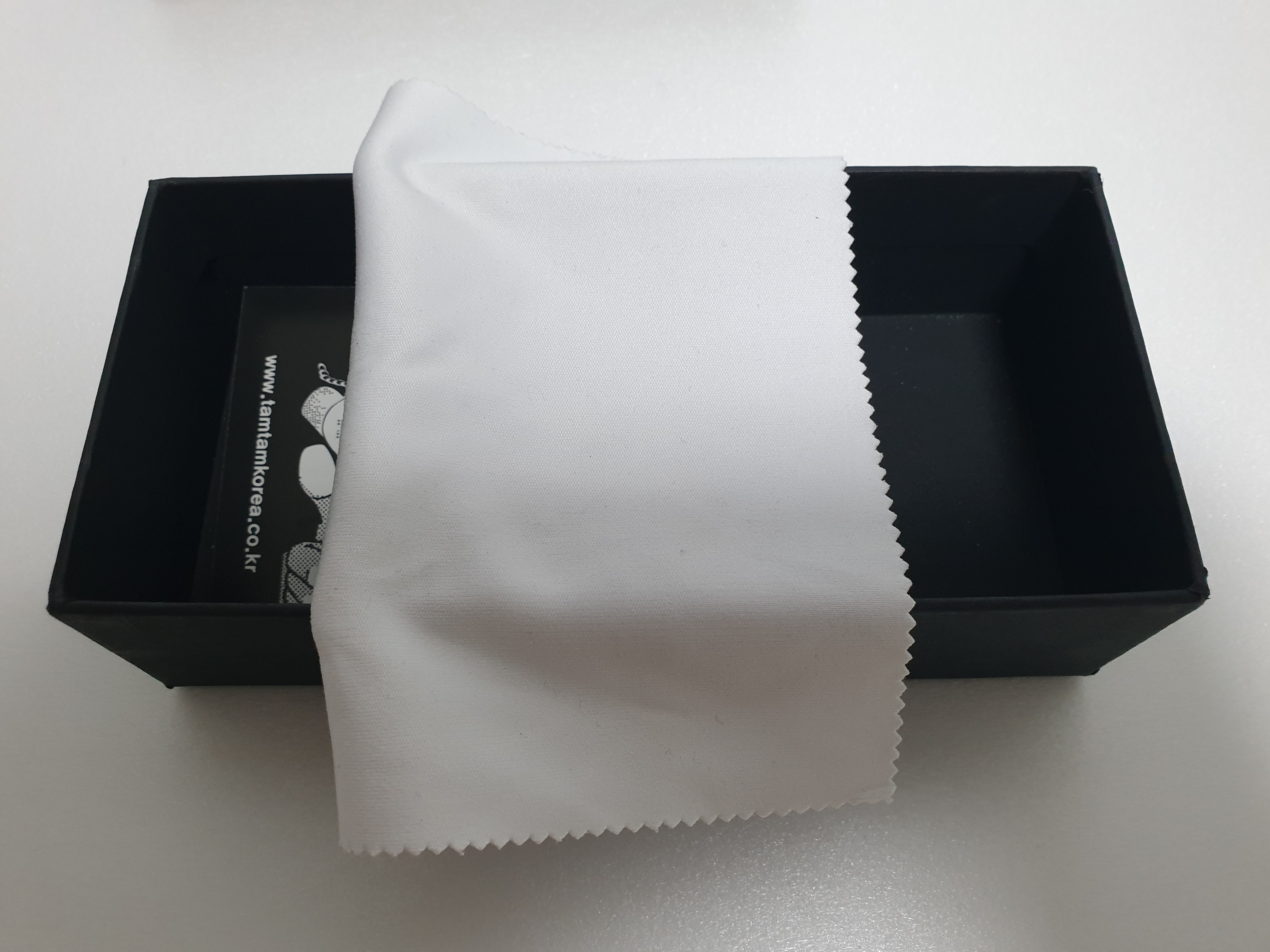흰색의 안경닦이천의 모습입니다. 탐탐 안경(PMambo_D.Brown-Black)의 원가는 95,000원이지만 저는 신세계몰에서 45,000원에 구매하였습니다.