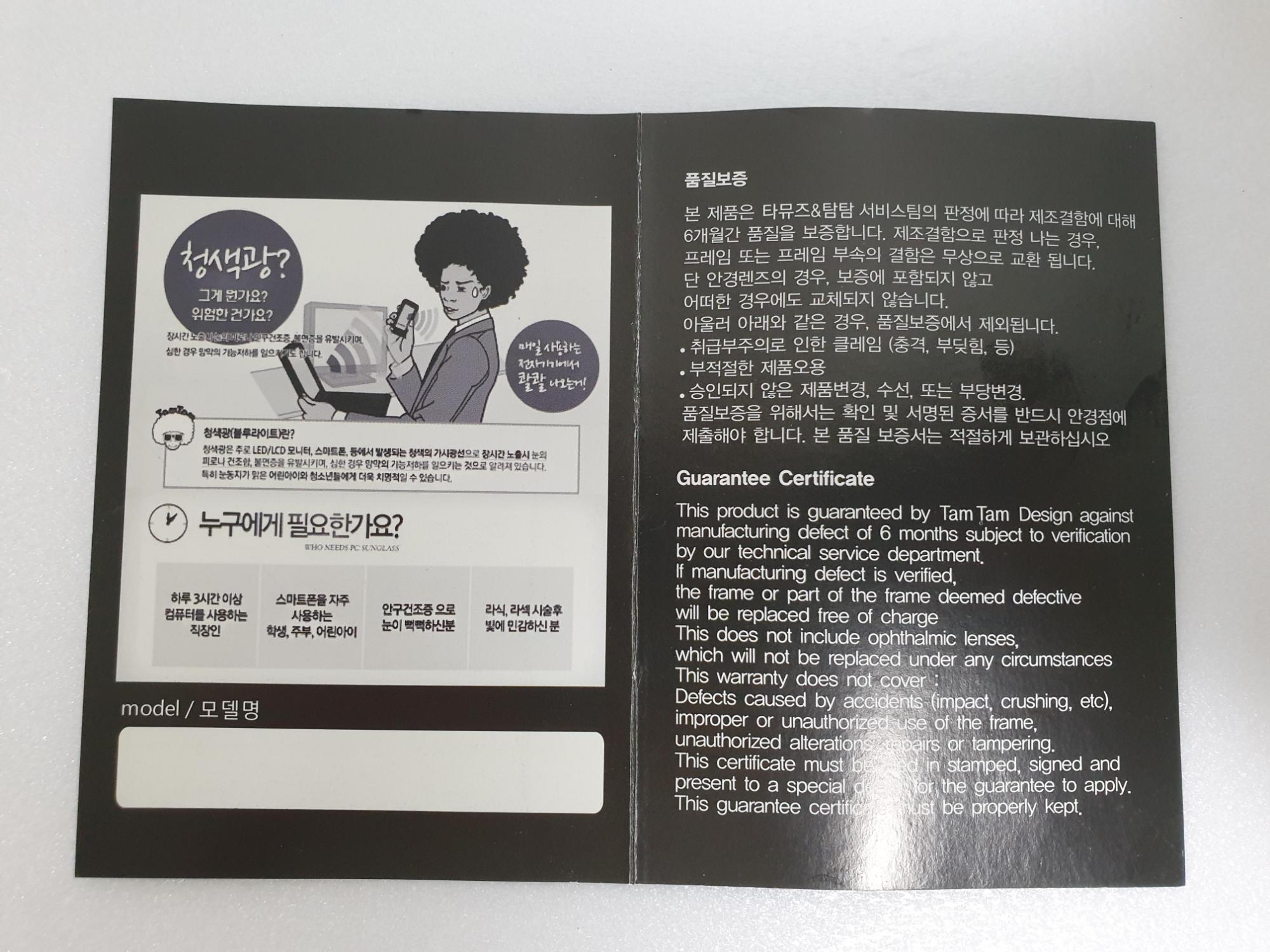 품질보증서의 뒷면에 블루라이트(청색광)를 47.3% 차단 가능하다고 나와있습니다.