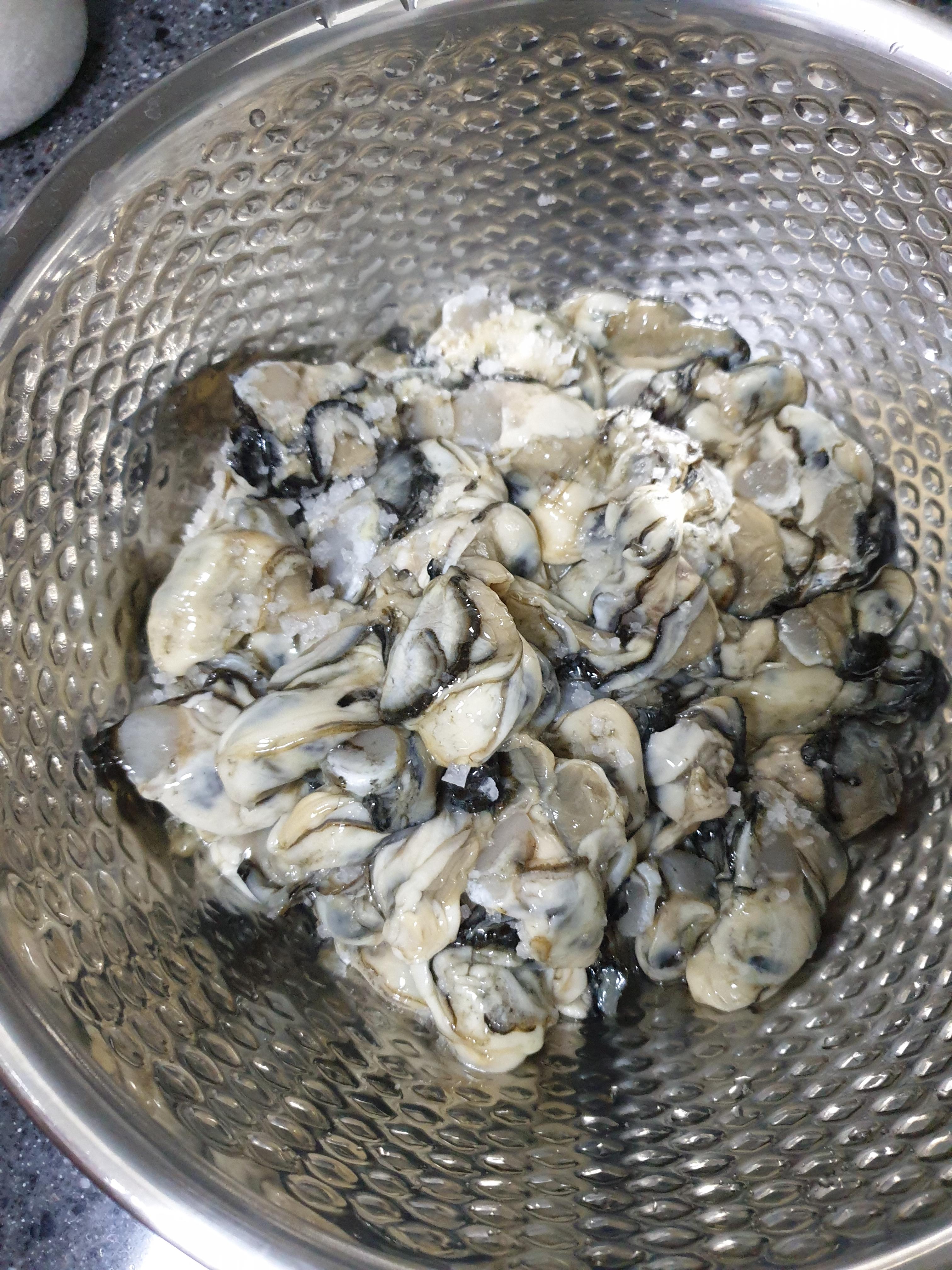 굵은소금을 이용해 굴 씻기를 시작합니다. 큰 술 가득 소금을 넣어주세요.