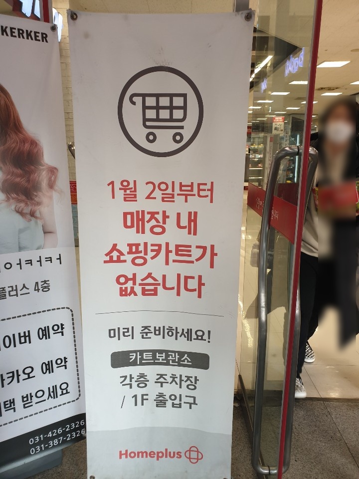 홈플러스 평촌점은 이마트와 달리 2020년부터 매장 내 쇼핑카트가 없습니다. 사진과 같이 1층 출입구 외부에 있거나 각층 주차장에 있으니 확인하시고 입장하시길 바랍니다.