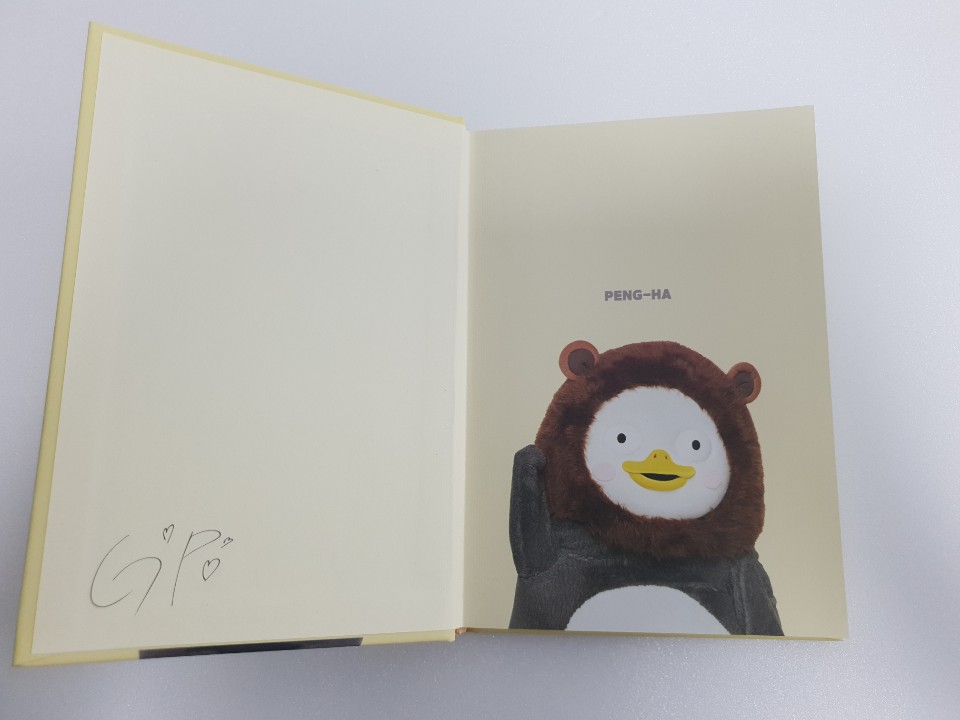 첫 장을 넘겨보니 우리를 보고 인사하는 펭수를 볼 수 있습니다. 왼쪽 하단에 펭수의 사인도 같이 있네요. GP 자이언트 펭의 약자입니다.