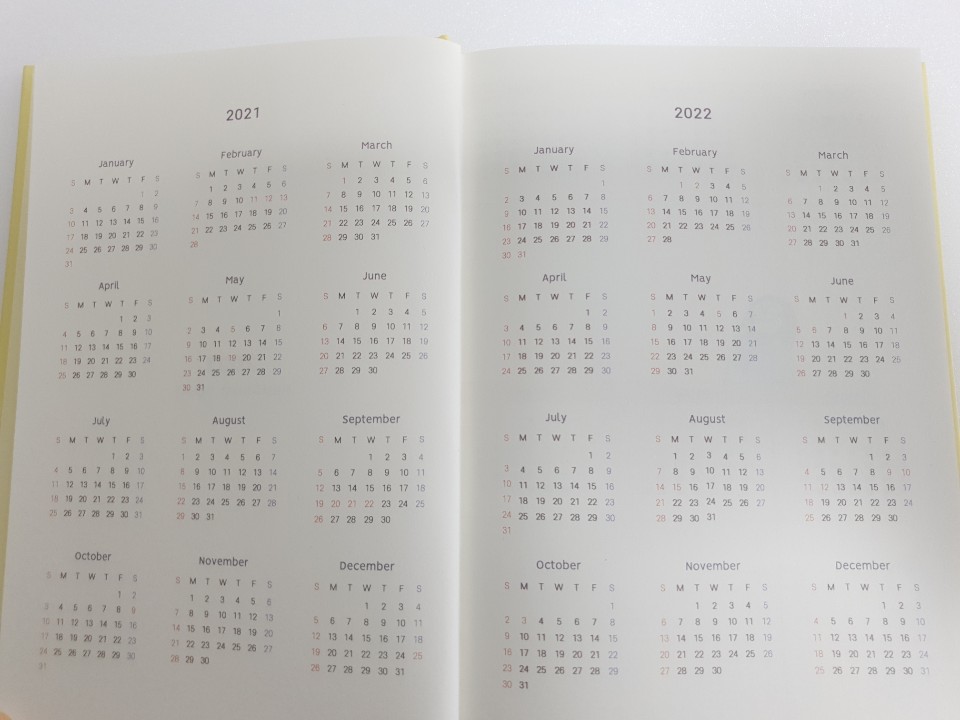 다음 장에는 2021년과 2022년의 달력을 한 눈에 보기 쉽게 정리해 놓았습니다. 저는 한 해가 시작되는 날에 연휴를 유심히 찾아봅니다. 생각보다 2022년 연휴가 많지 않은 것 같네요... 조금 실망하고 갑니다...