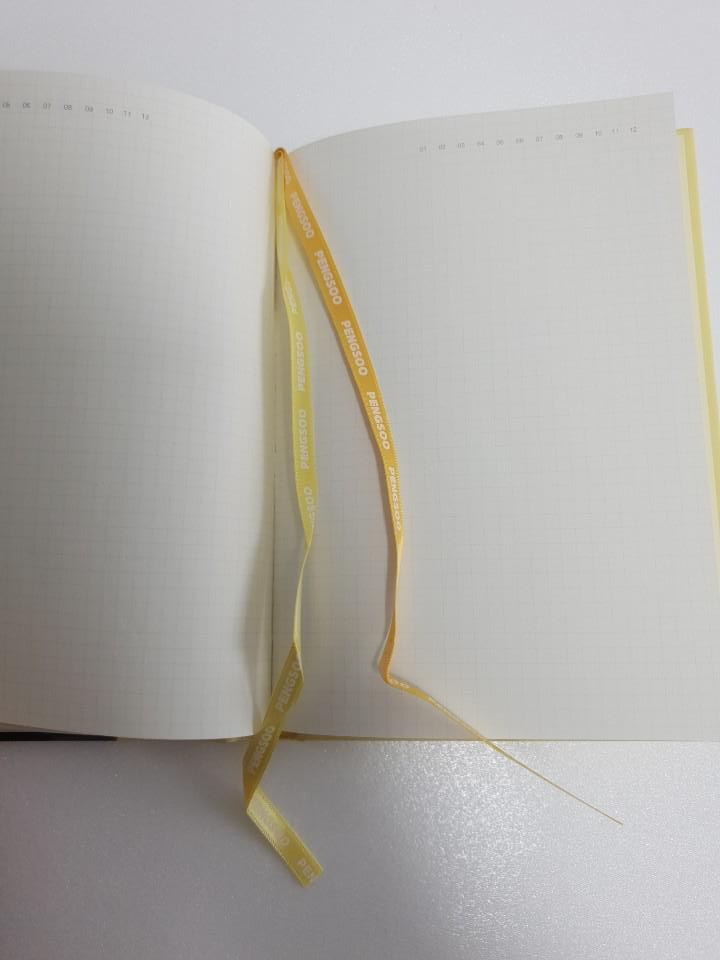 넘기다 보면 진한 노란색과 연한 노란색으로 구성된 책갈피가 보입니다. PENSOO가 적힌 것들이 반복되어 있네요. 이것을 통해 표시를 해 두면 다음번에 쉽게 원하는 장을 찾을 수 있습니다.