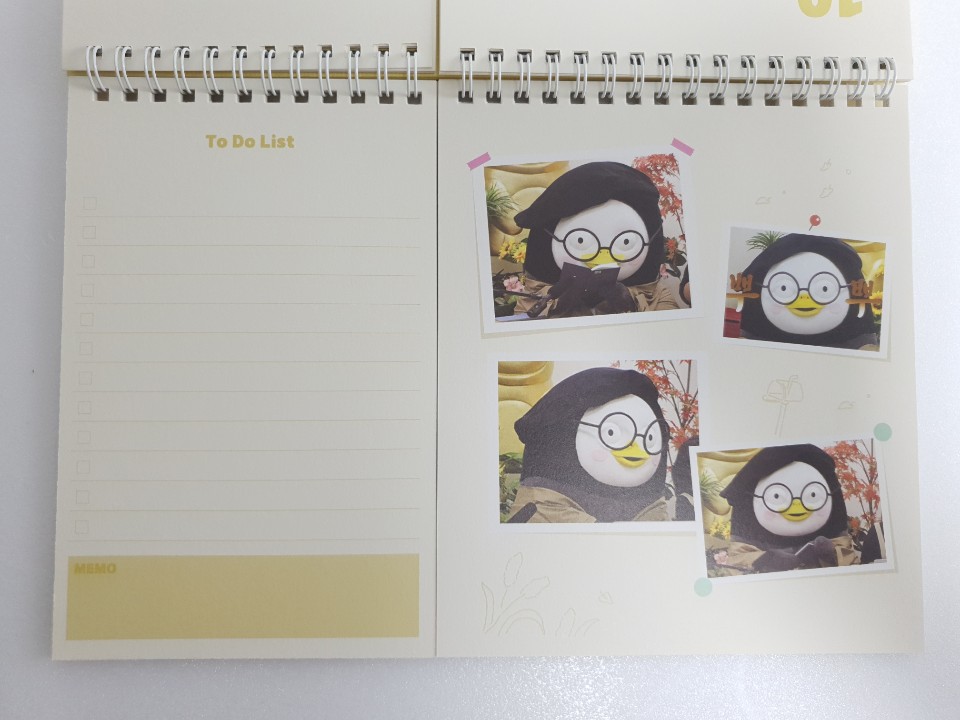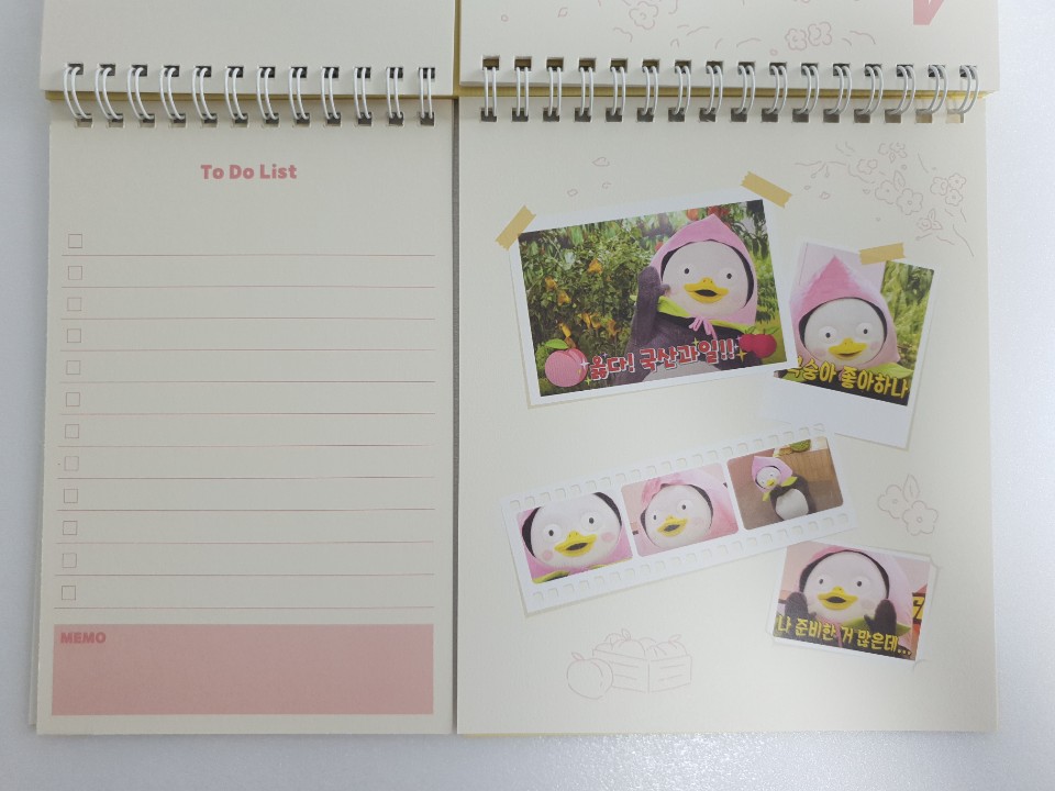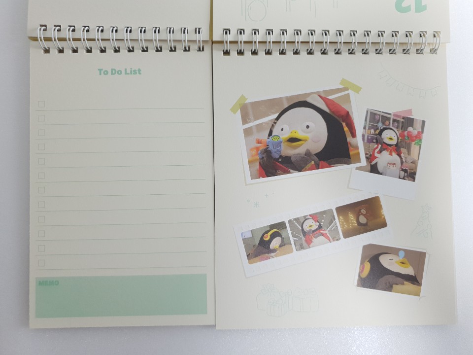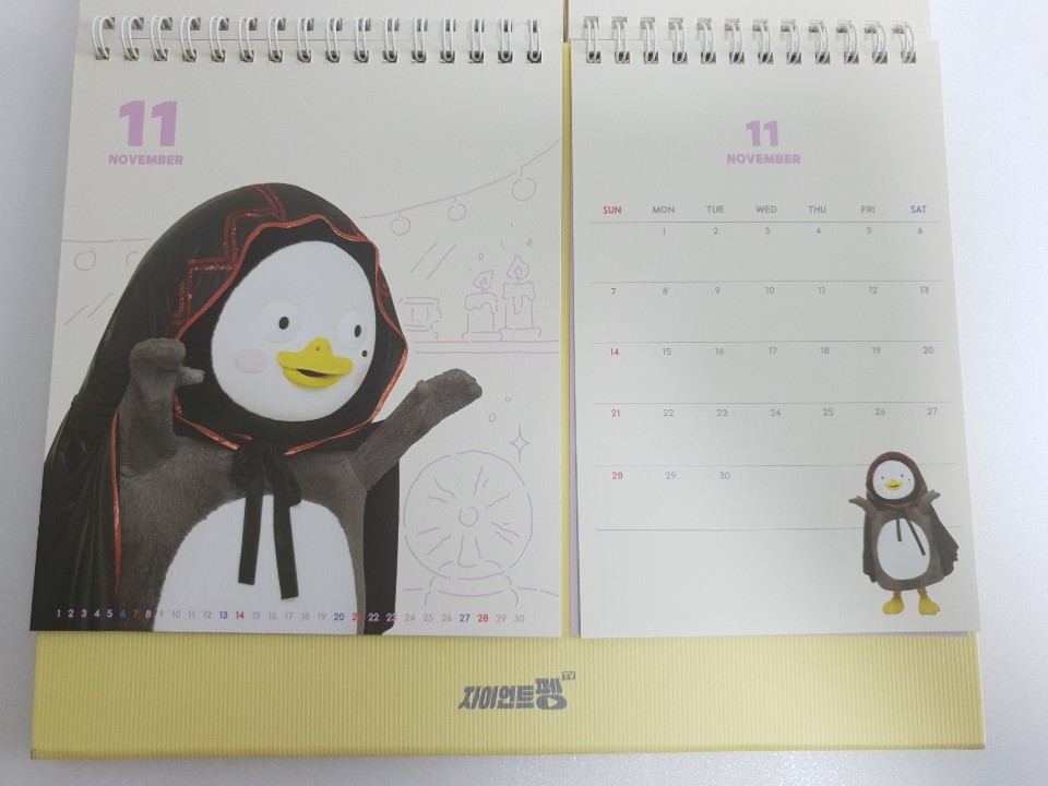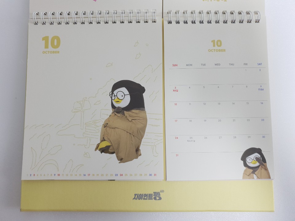 포장지를 벗기고 본격적으로 펭수 달력을 확인해 보았습니다. 달력 디자인이 특이하게 2등분으로 나누어져 있습니다. 나뉘어진 각각이 어떤 구성으로 이루어져 있는지 사뭇 궁금하네요.