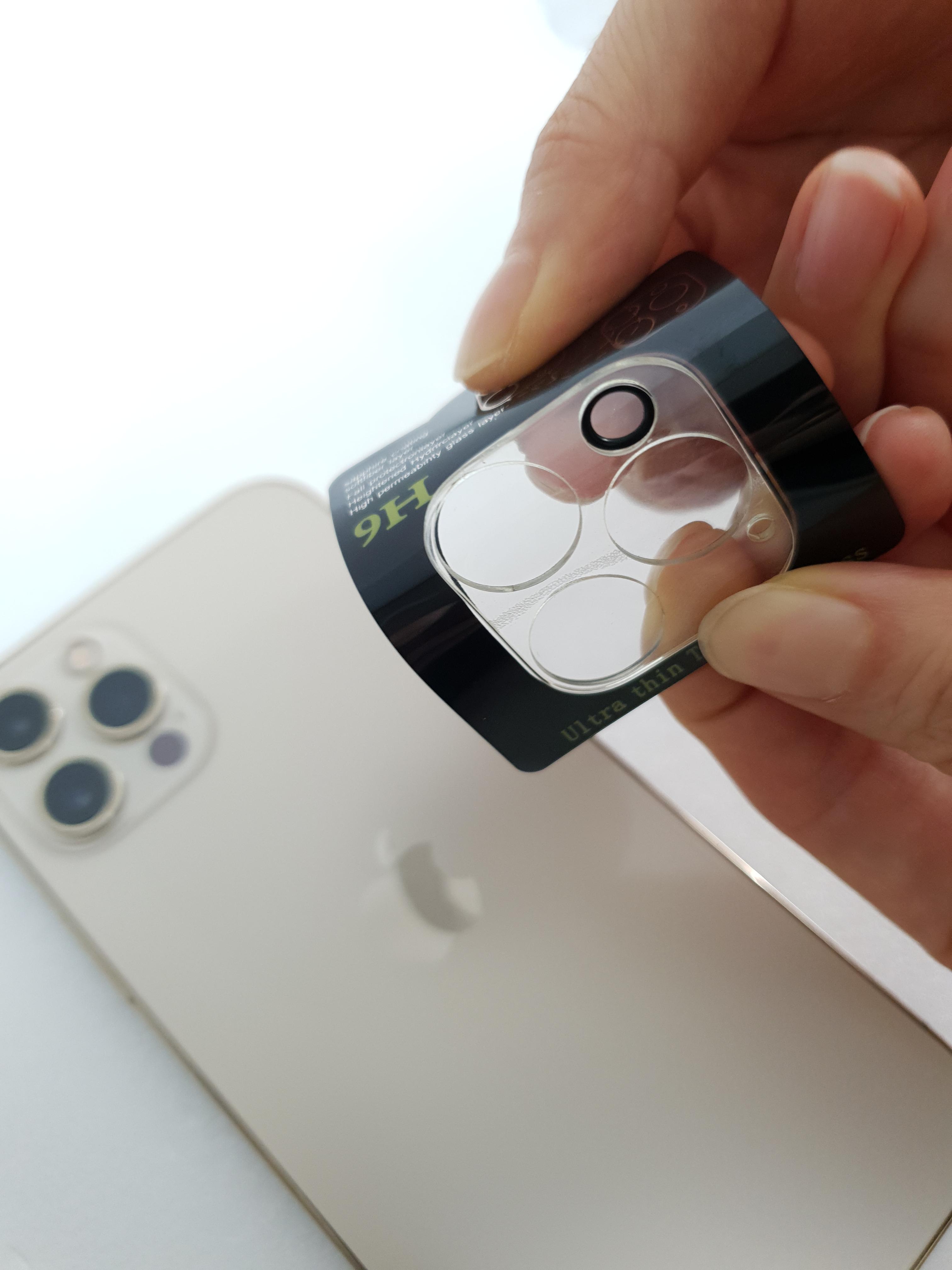 보호필름 뒷면의 스티커를 떼어서 아이폰12 카메라 렌즈에 붙일 준비를 마칩니다.