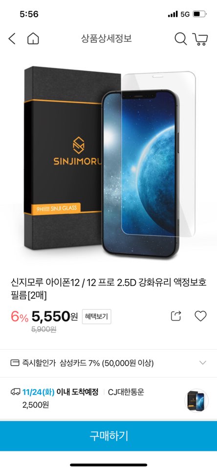 저는 CJ 몰에서 신지모루 아이폰12/12 pro 액정보호필름과 카메라 전용 강화유리를 구매하였습니다.