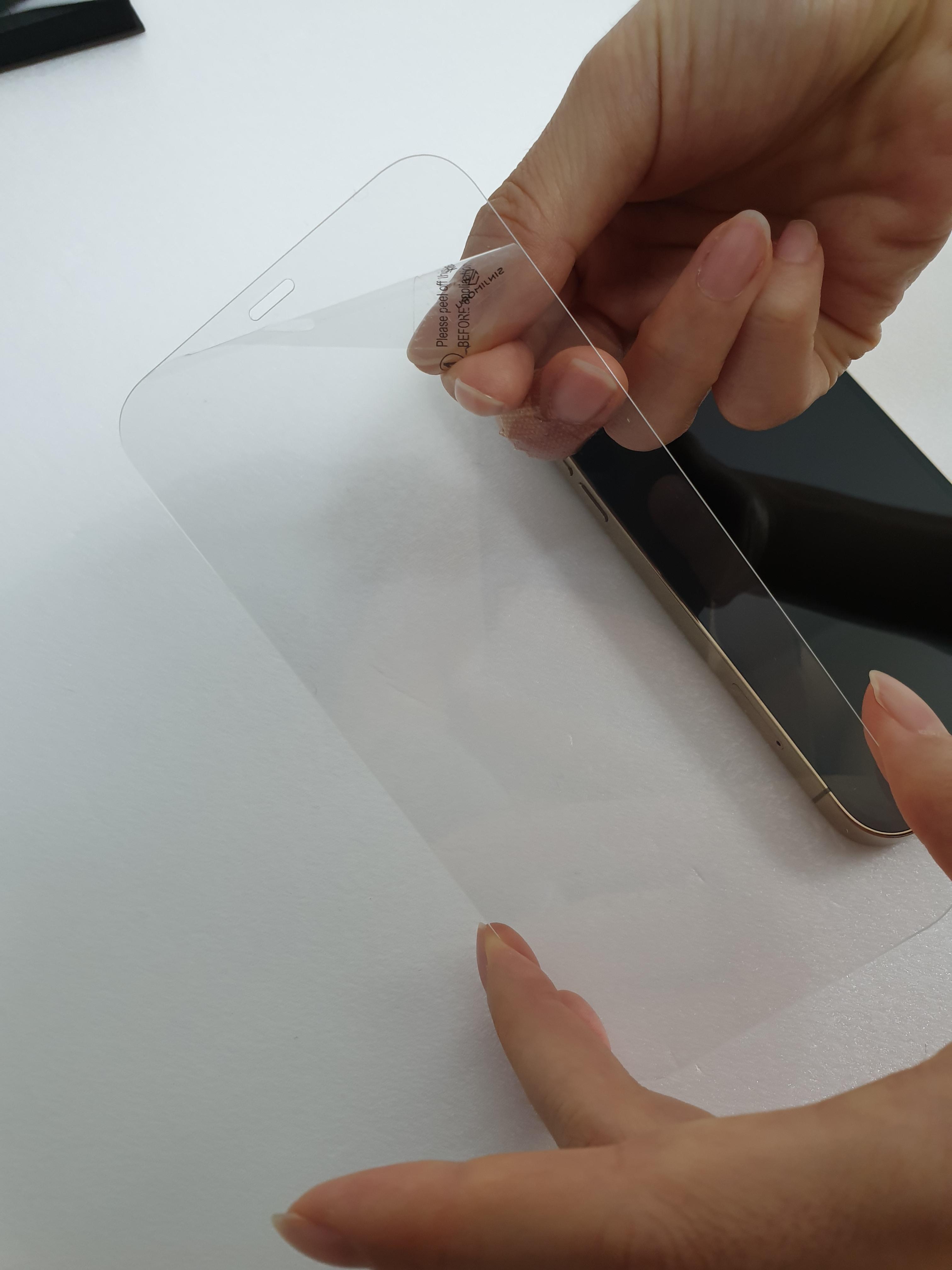 보호필름 뒷면의 스티커를 떼어서 아이폰12 화면에 붙일 준비를 마칩니다.