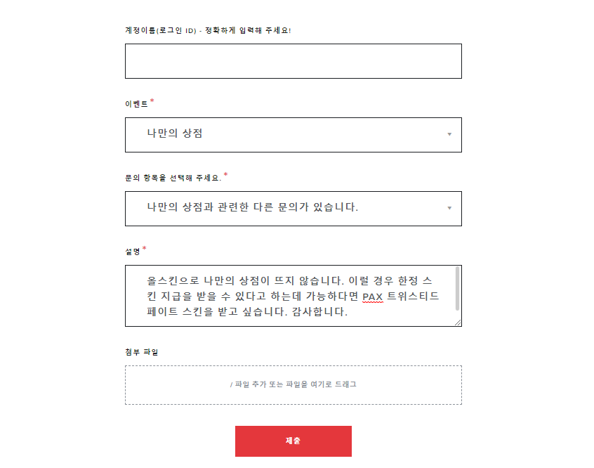 설명란에는 올스킨 유저이기 때문에 한정 스킨을 받고 싶다는 이유를 작성해주시면 됩니다. 저는 '올스킨으로 나만의 상점이 뜨지 않습니다. 이럴 경우 한정 스킨 지급을 받을 수 있다고 하는데 가능하다면 PAX트위스티드 페이트 스킨을 받고 싶습니다. 감사합니다.'로 작성하였습니다.