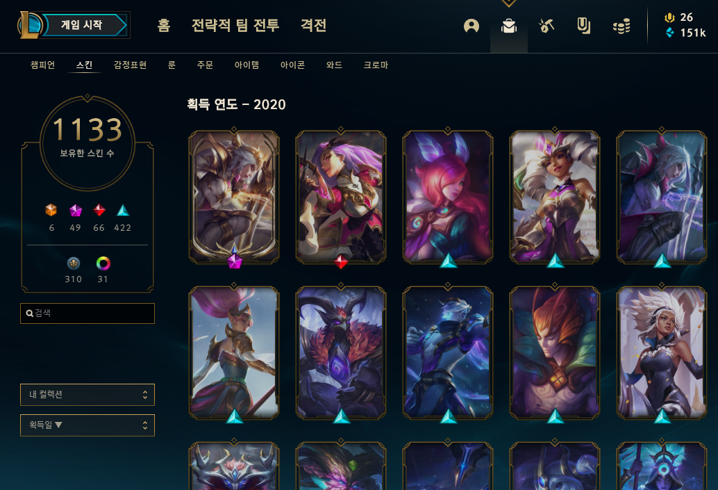 지금까지 보유한 스킨 수는 총 1133개입니다. 그러나 사람마다 롤 올스킨의 개수가 다릅니다. 그 이유는 한정 스킨이나 시즌 보상 스킨 등을 받고 안 받고의 개인차가 존재하기 때문입니다.