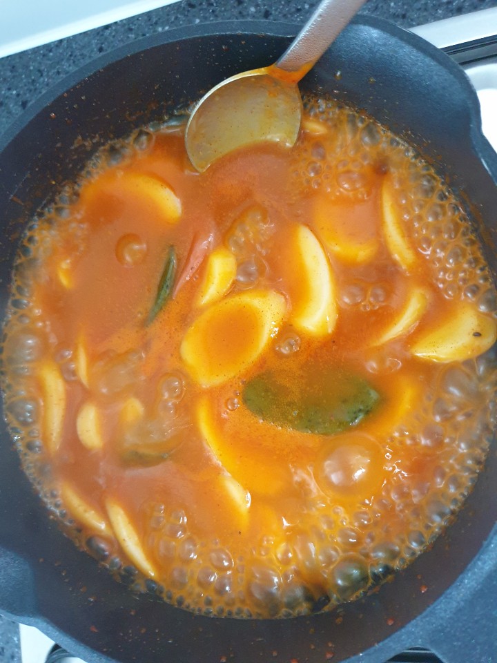 순정 떡볶이 국물이 진득해질 때까지 계속 저어주셔야 합니다. 잘 저어주셔야지 떡들이 달라붙지 않은 상태로 국물이 쫄아듭니다.