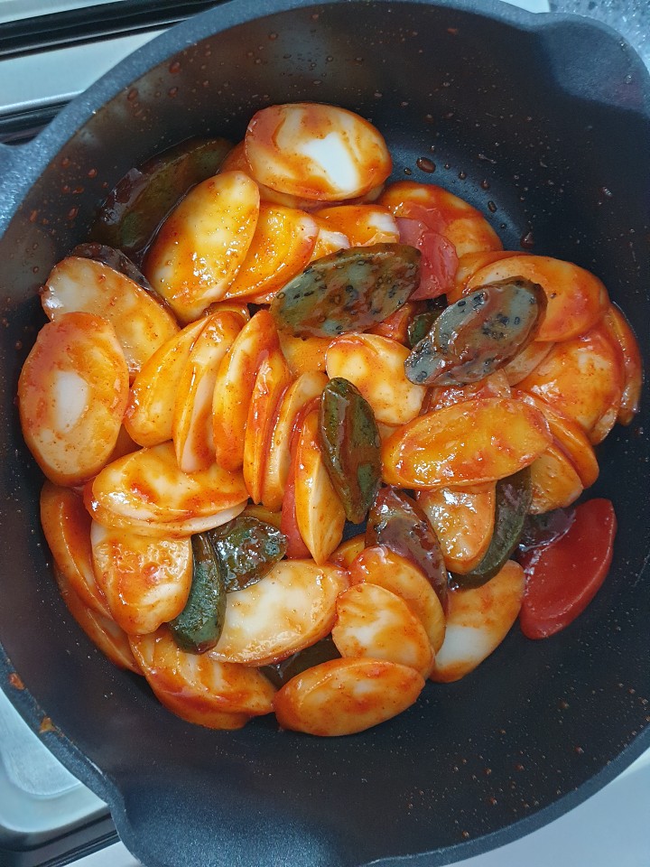 국물과 떡이 잘 어우려졌다면 대파를 넣고 약 1분간 더 졸여주세요.
