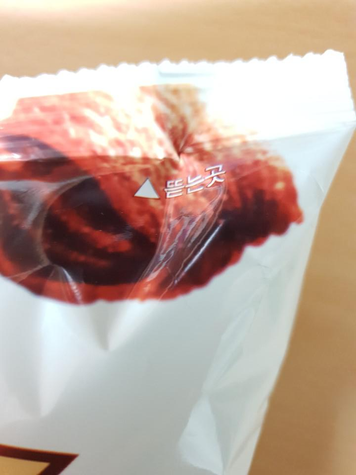 뒷면 오른편에는 제품명, 식품유형 및 소재지가 나와있습니다. 원재료로 다양한 재료가 들어가 있네요. 이제 뜯는 곳을 통해 과자봉지를 개봉해보도록 하겠습니다.