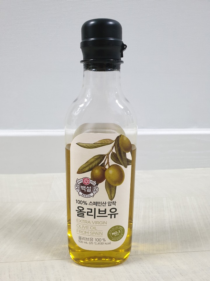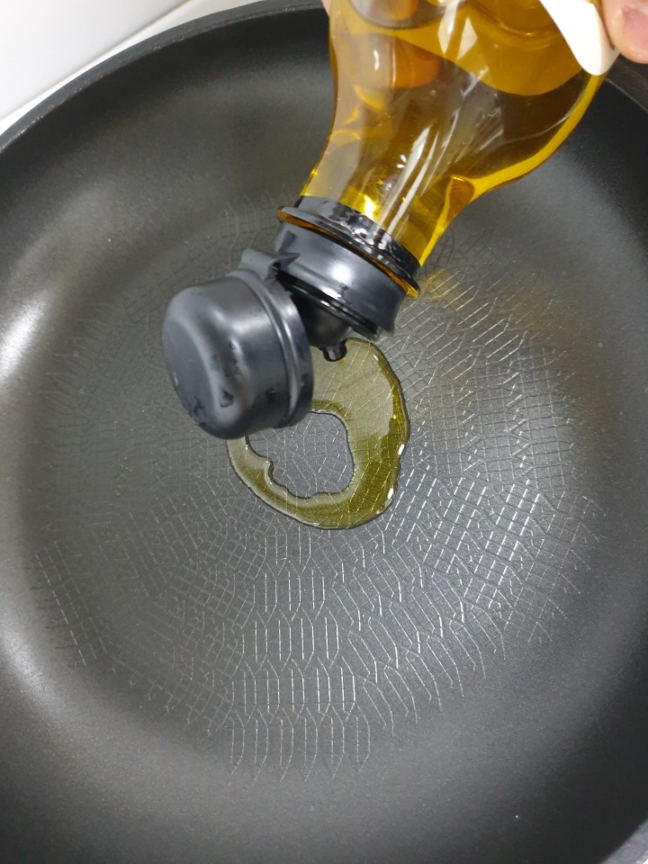 달궈진 후라이팬에 올리브유를 둘러줍니다.