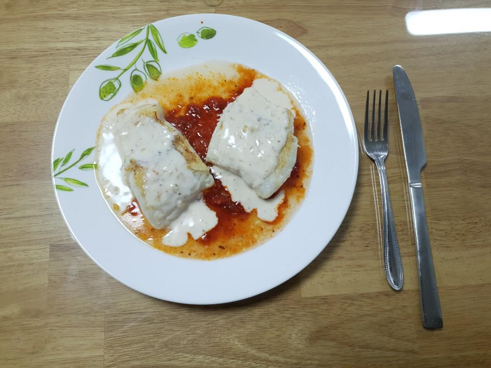 원래는 갈아 놓은 토마토를 넣어야 한다고 하는데, 저는 토마토 스파게티 소스를 이용하여서 불안하기도 했습니다. 그런데 전혀 지장이 없다는 것을 말씀드리고 싶네요. 소스의 궁합은 매우 좋습니다:)