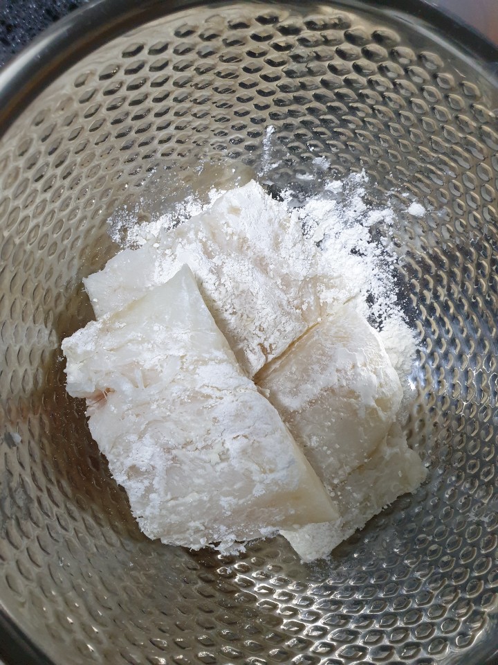 대구에 부침가루가 입혀졌으면 살살 털어서 그릇에 옮겨 담아 주세요.
