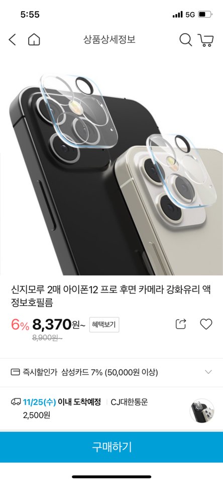 저는 CJ 몰에서 신지모루 아이폰12/12 pro 액정보호필름과 카메라 전용 강화유리를 구매하였습니다.