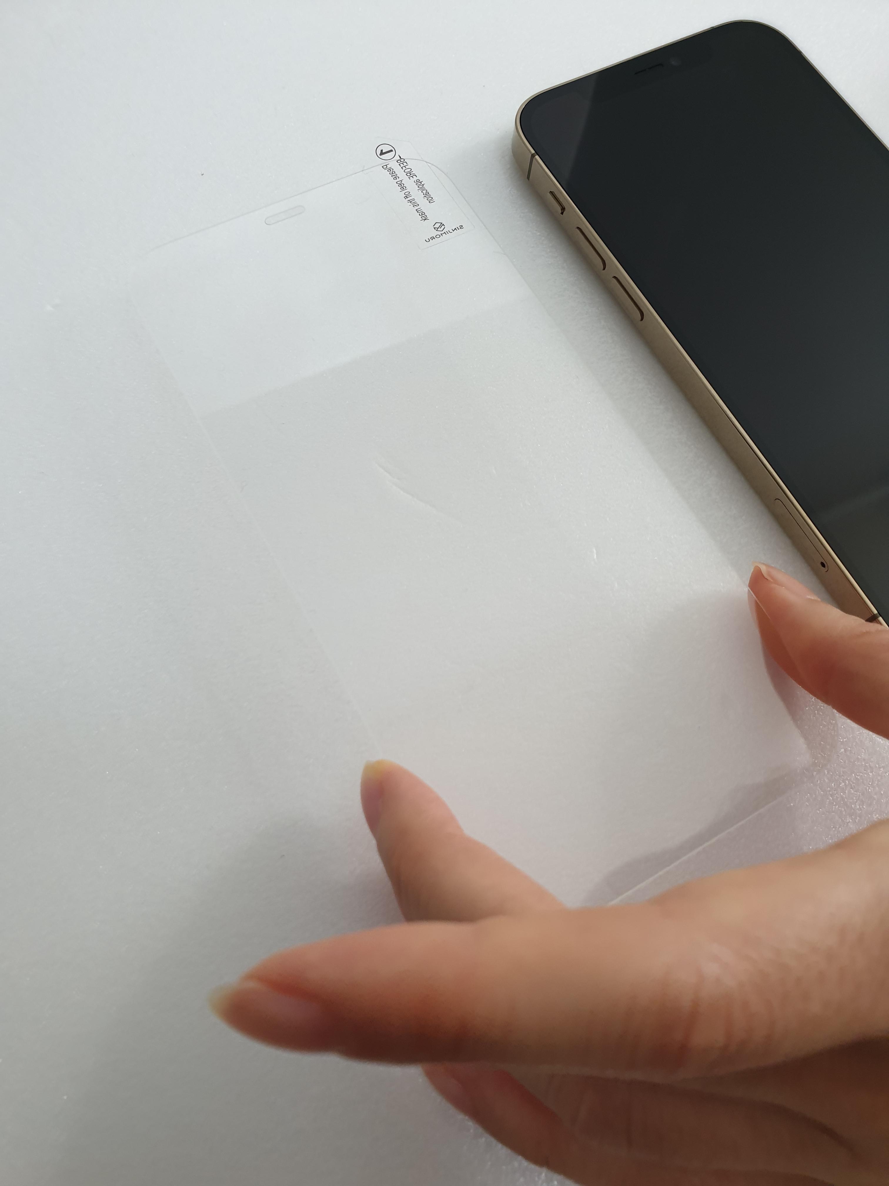 보호필름 뒷면의 스티커를 떼어서 아이폰12 화면에 붙일 준비를 마칩니다.