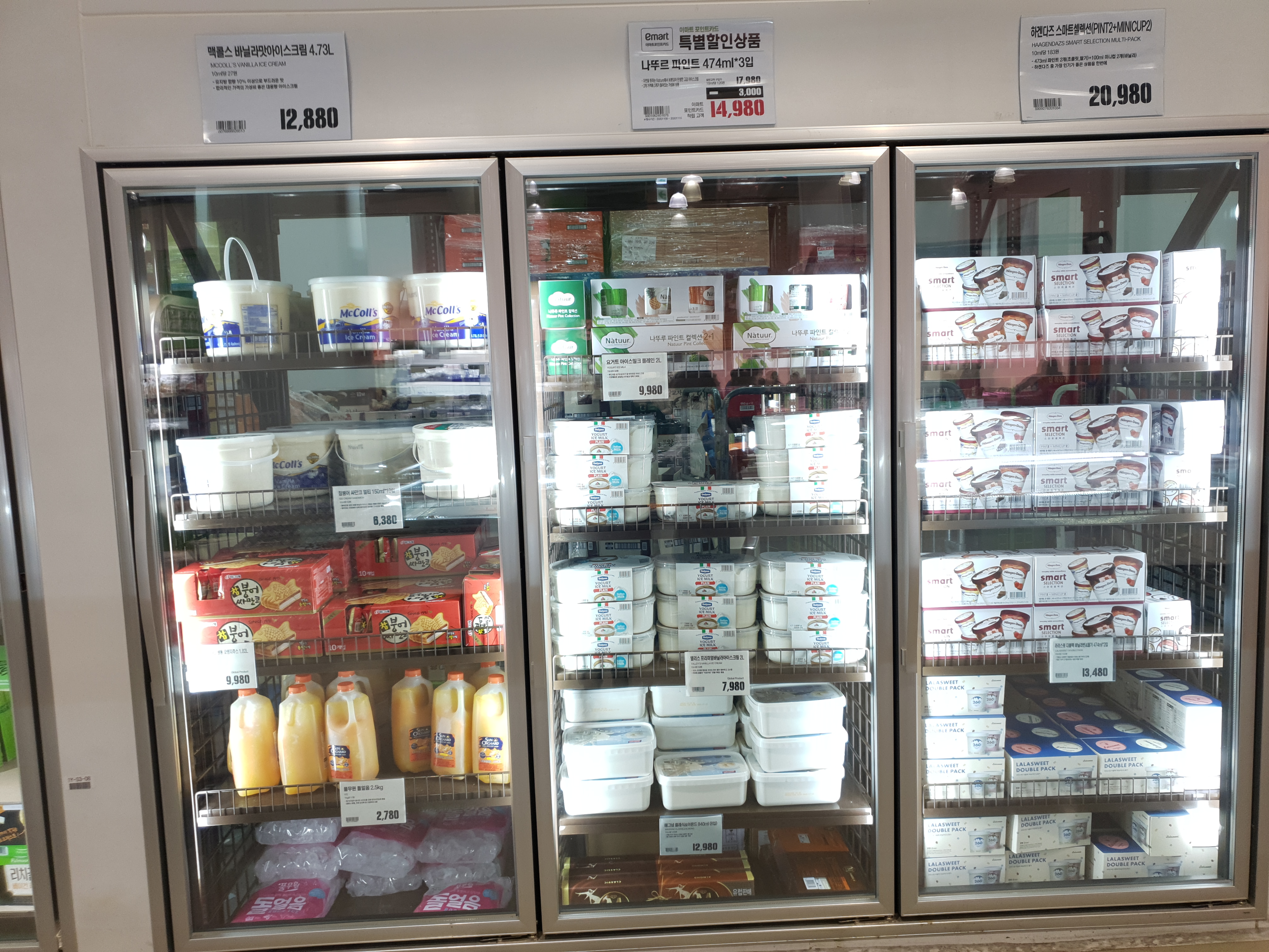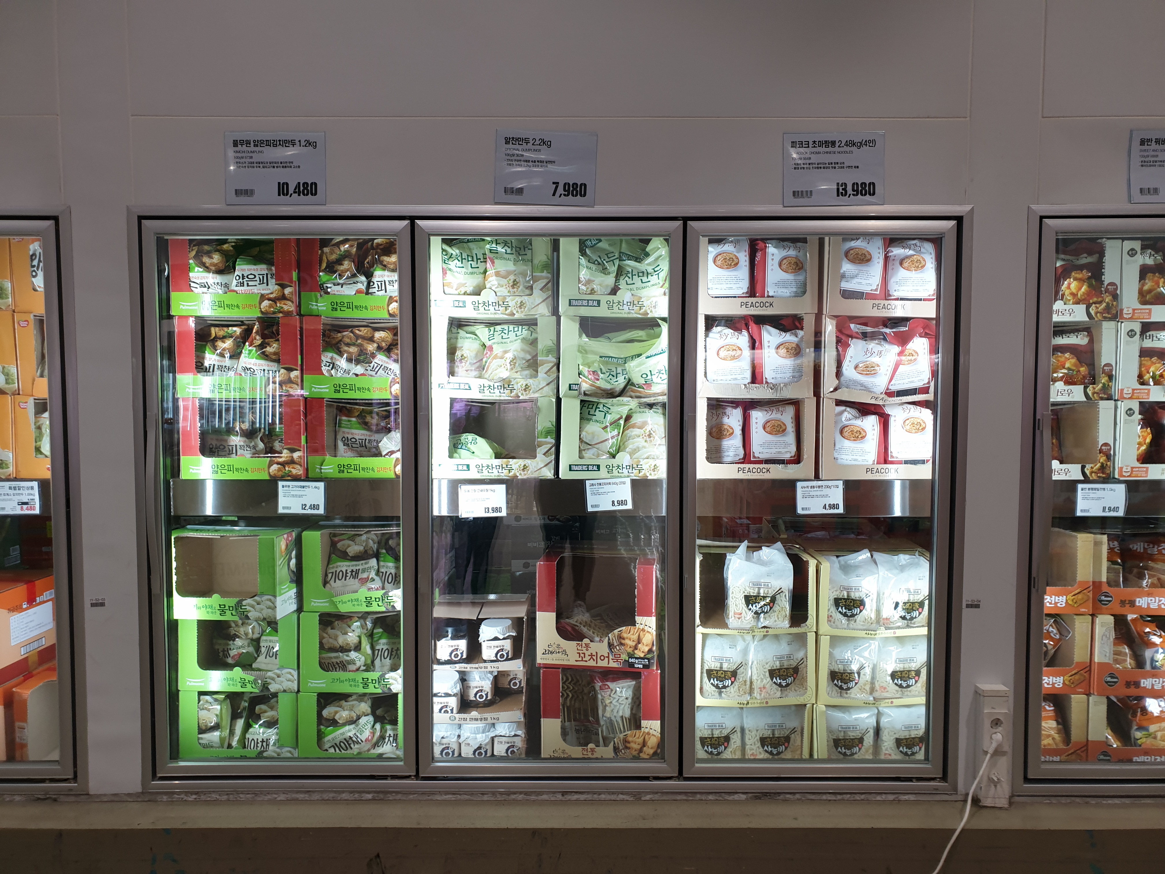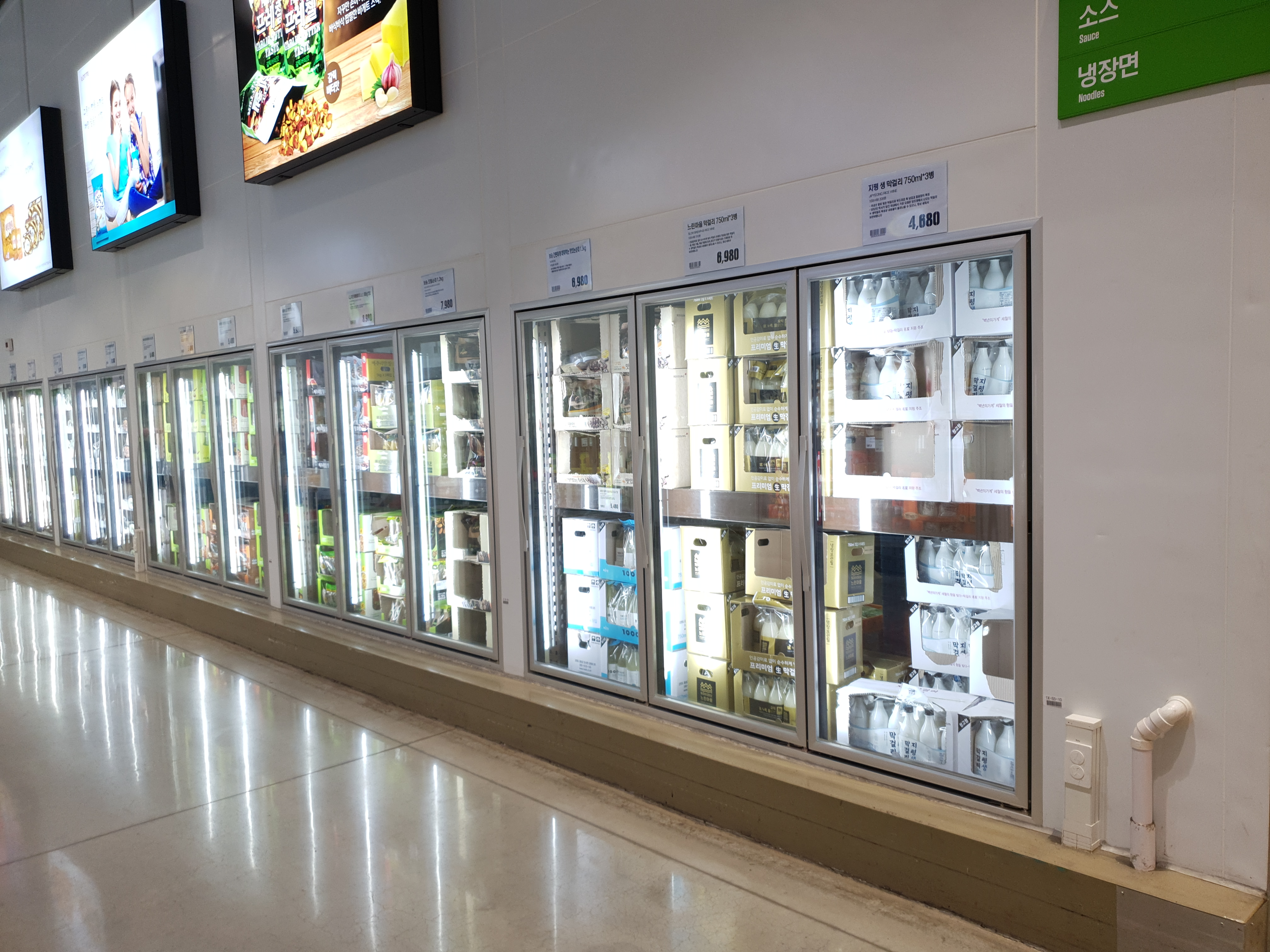 냉동과 냉장식품들이 가지런히 정렬되어 있습니다.