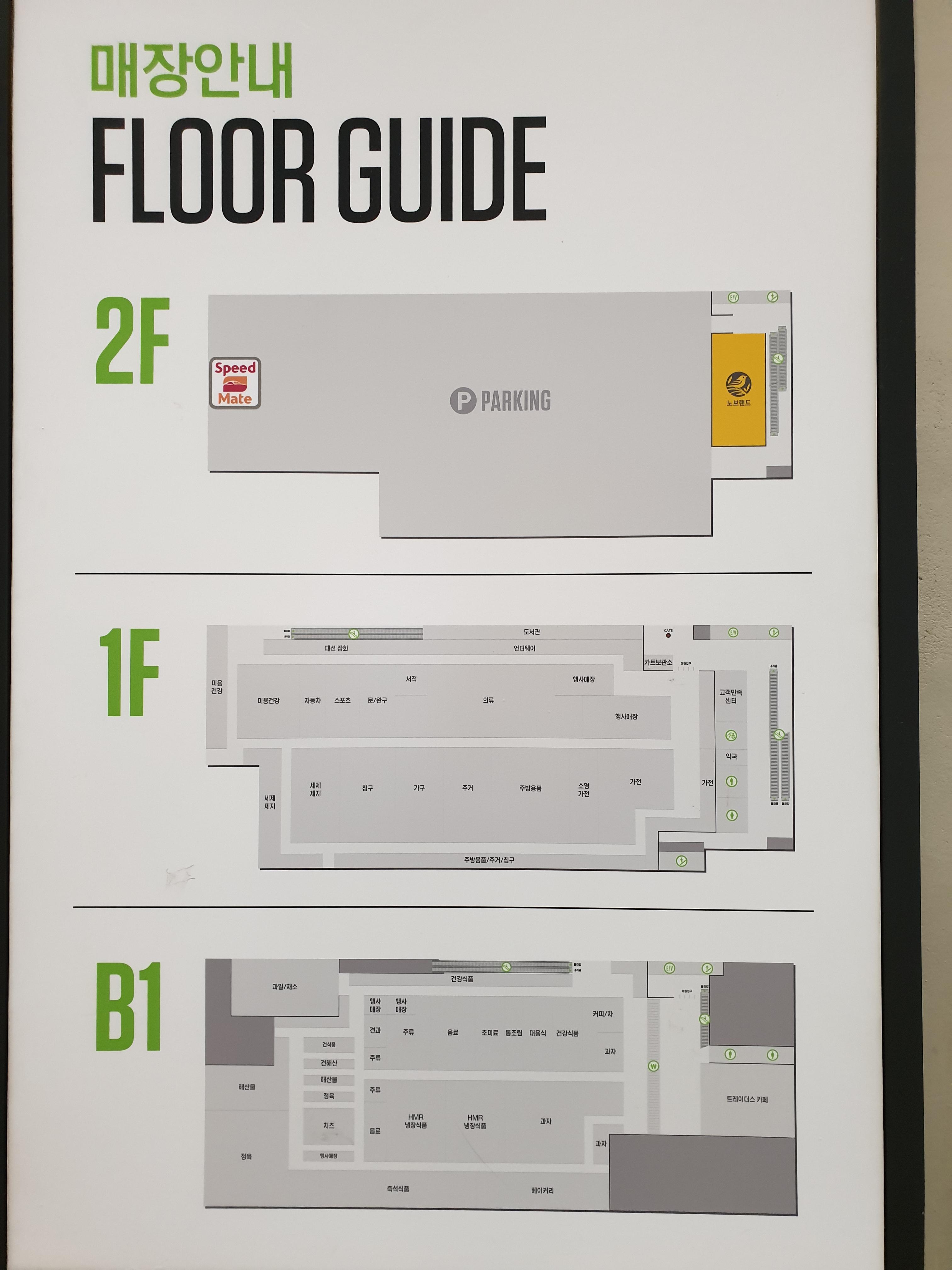 1층에는 고객만족센터, 문구/서적, 완구, 일상/생활용품, 패션/잡화, 약국, 가전이 위치하고 있네요.