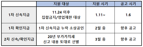 1차 신속 지급 신청은 1월 11일부터 시작되었습니다. 11일과 12일 양일로 나누어 사업자등록번호 끝자리 홀/짝 기준으로 신청을 받았습니다. 3차 재난지원금은 2월과 3월 두 차례 지급되며, 향후에 공고된다고 하니 지속적으로 정보 확인하시면 됩니다.