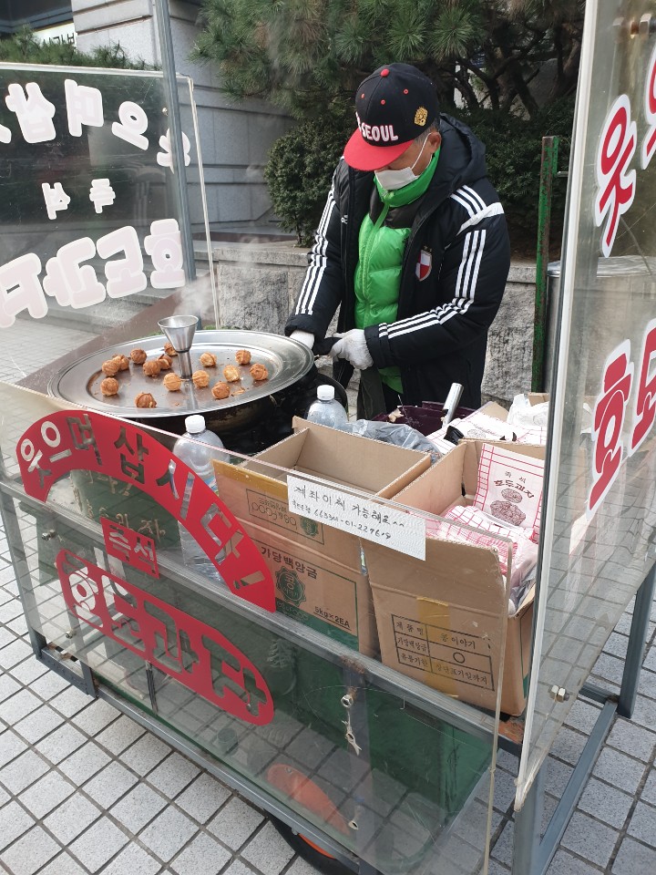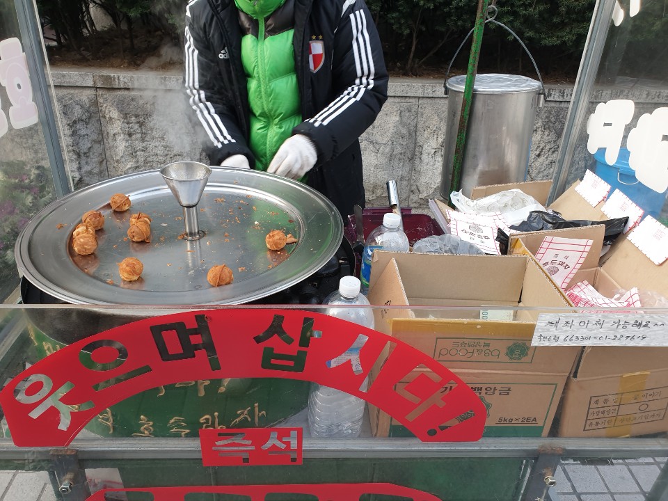 '웃으며 삽시다!'라는 적혀 있는 가판대에서 즉석 호두과자를 판매하고 계신 사장님. 그런데 호도과자라고 적혀있네요? 오타인지 마케팅인지 모를 네임명입니다.