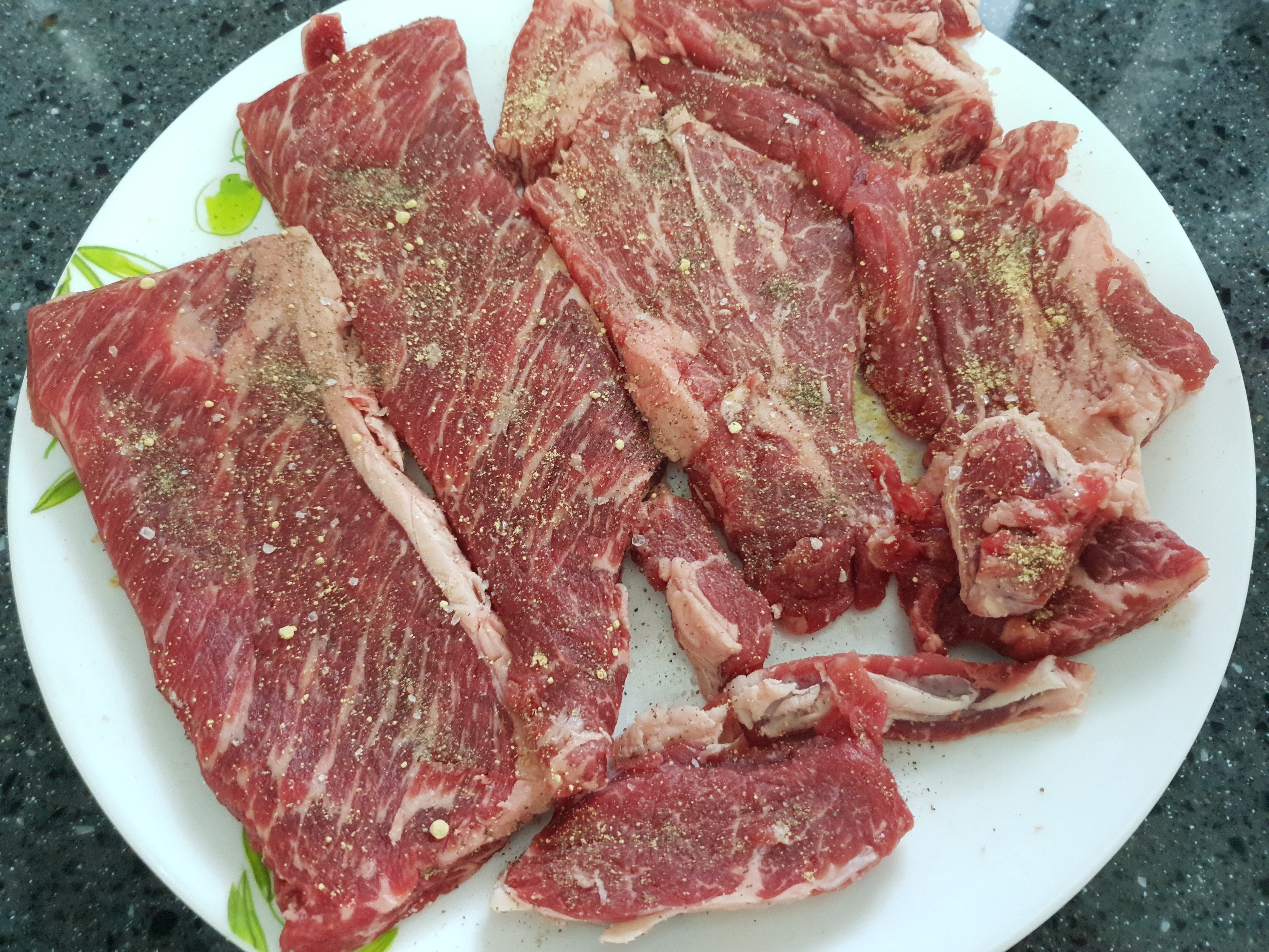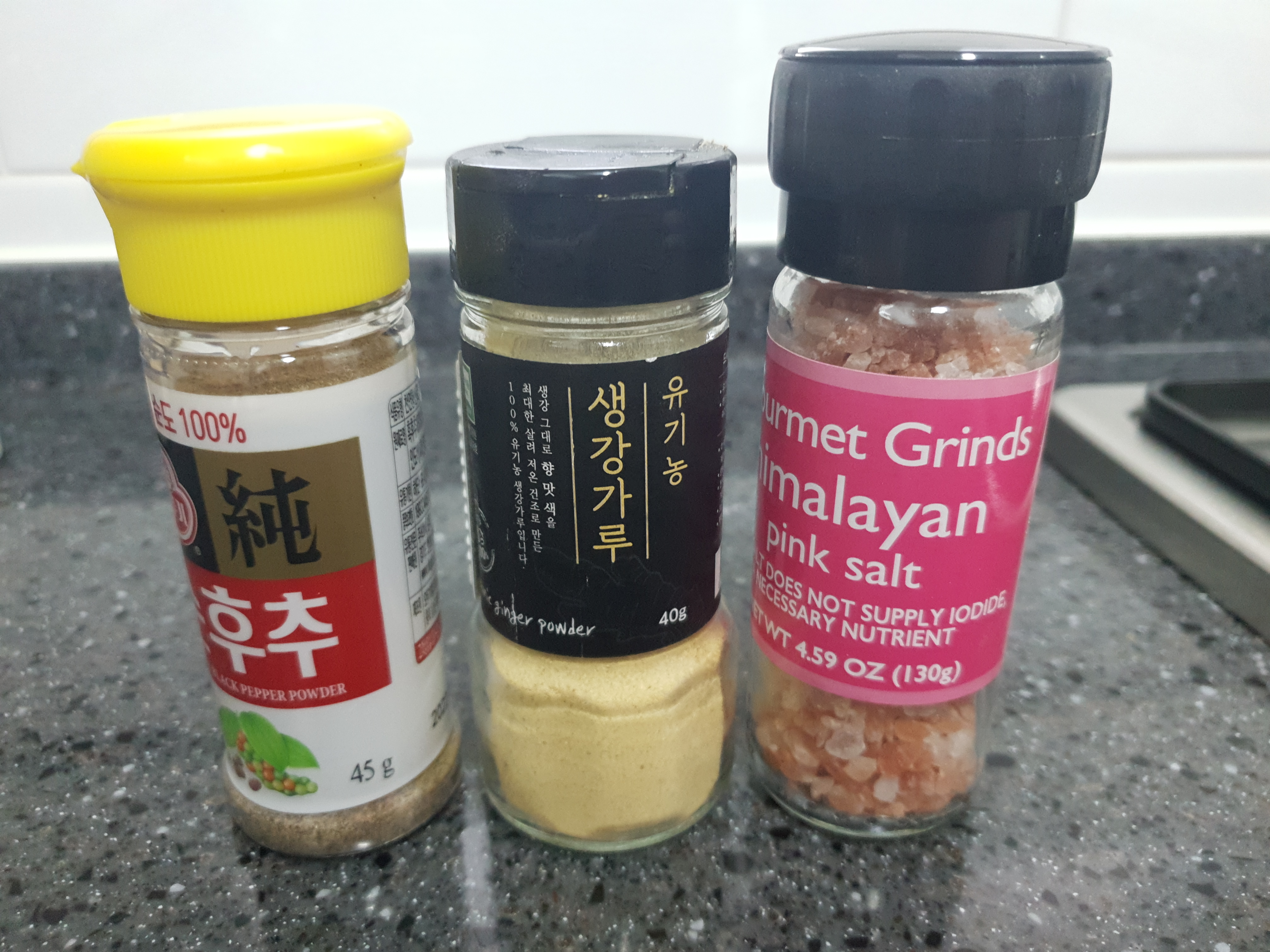 후추, 생강가루, 소금을 이용해 소고기 앞과 뒷면에 시즈닝을 하였습니다.
