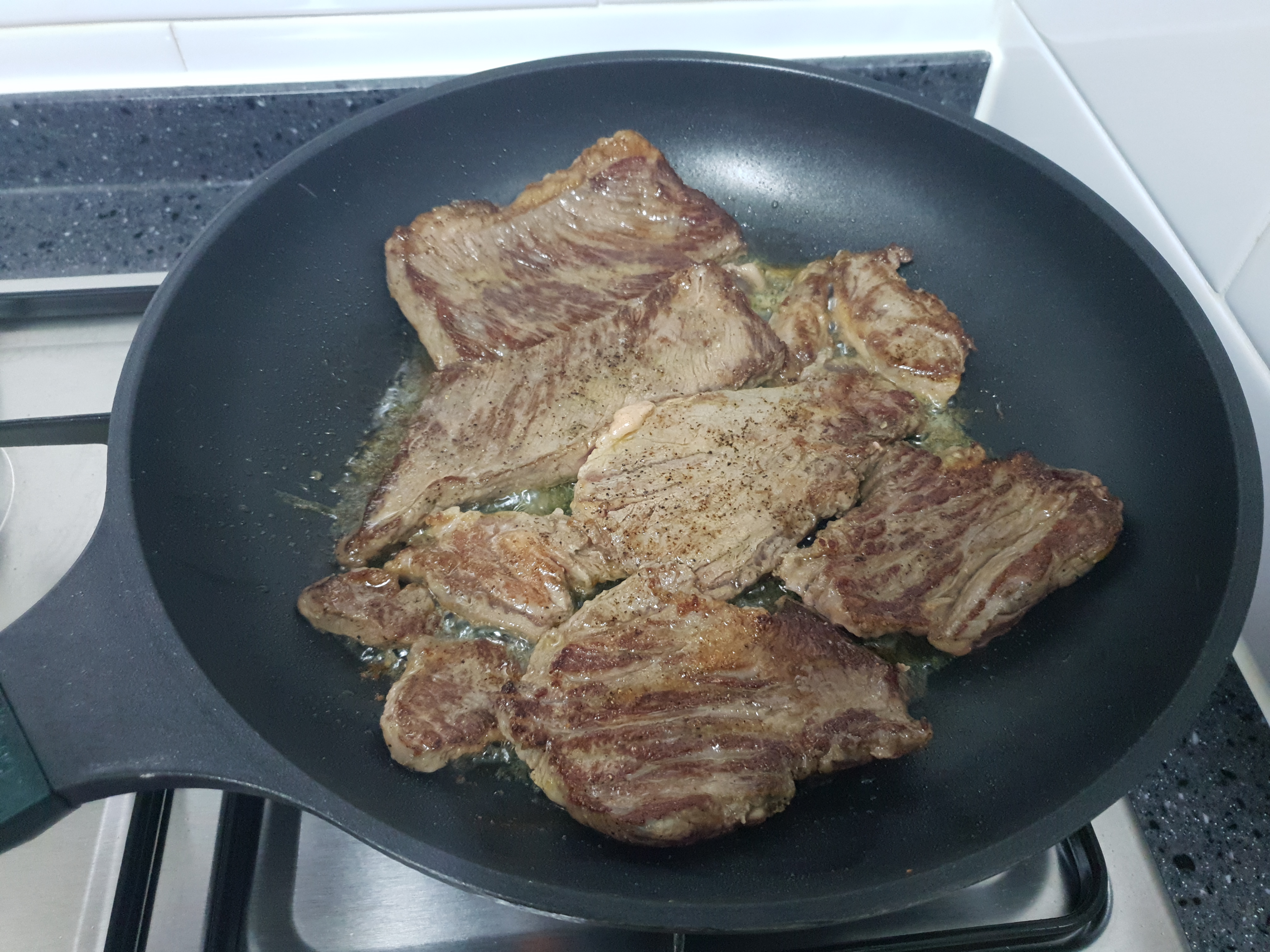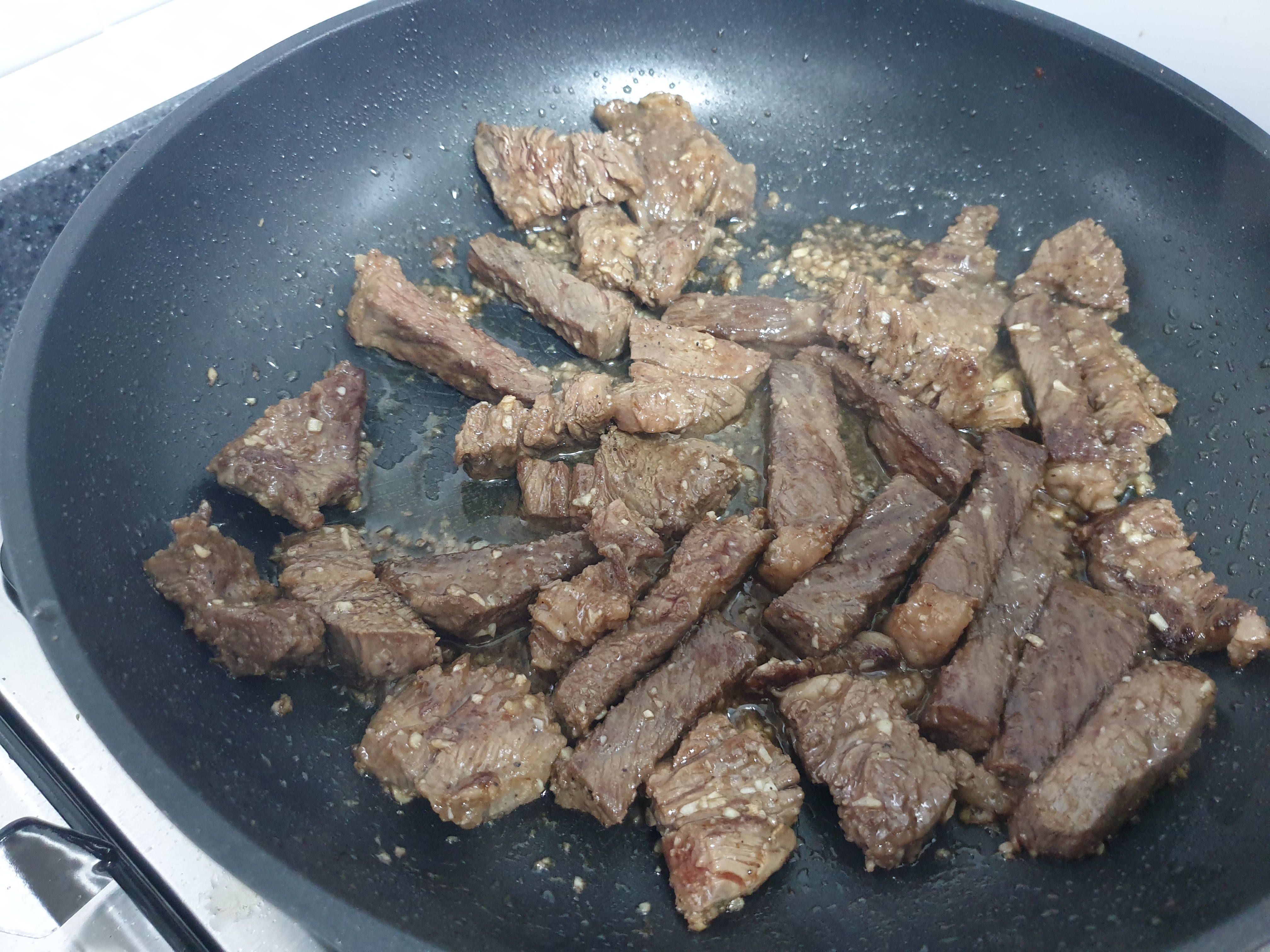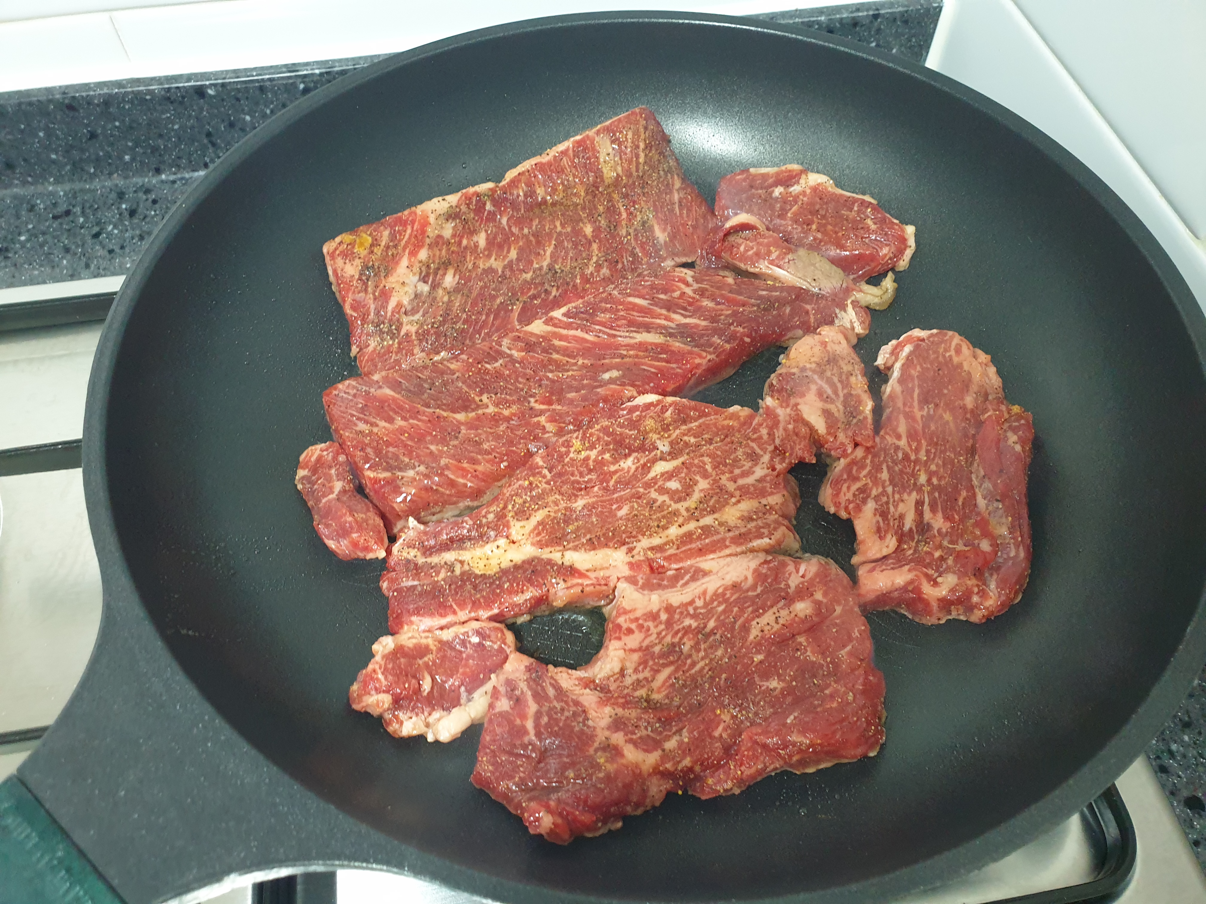 양념이 소고기에 잘 베였으면 이제 굽기를 시작합니다. 이전과 동일하게 달궈진 프라이팬에 소고기를 올려놓습니다.