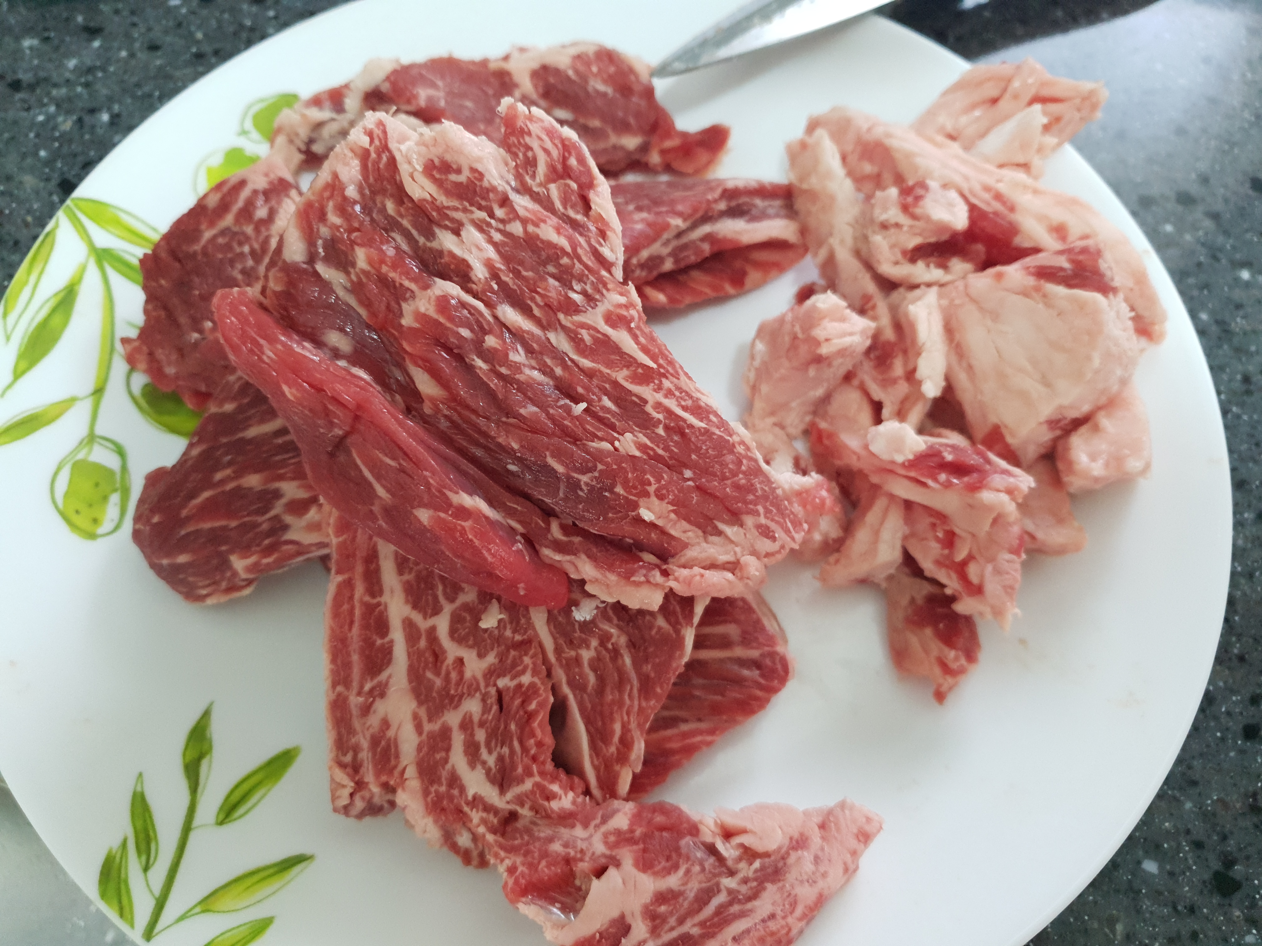핏기를 제거한 프라임 척 아이롤 소고기의 비계를 가위로 제거해 줍니다. 비계를 막상 제거하니 먹을거리가 많이 줄어든 것을 볼 수 있었습니다. 비계가 붙어 있을 때는 몰랐는데 제거되고 나니 뭔가 징그럽습니다.