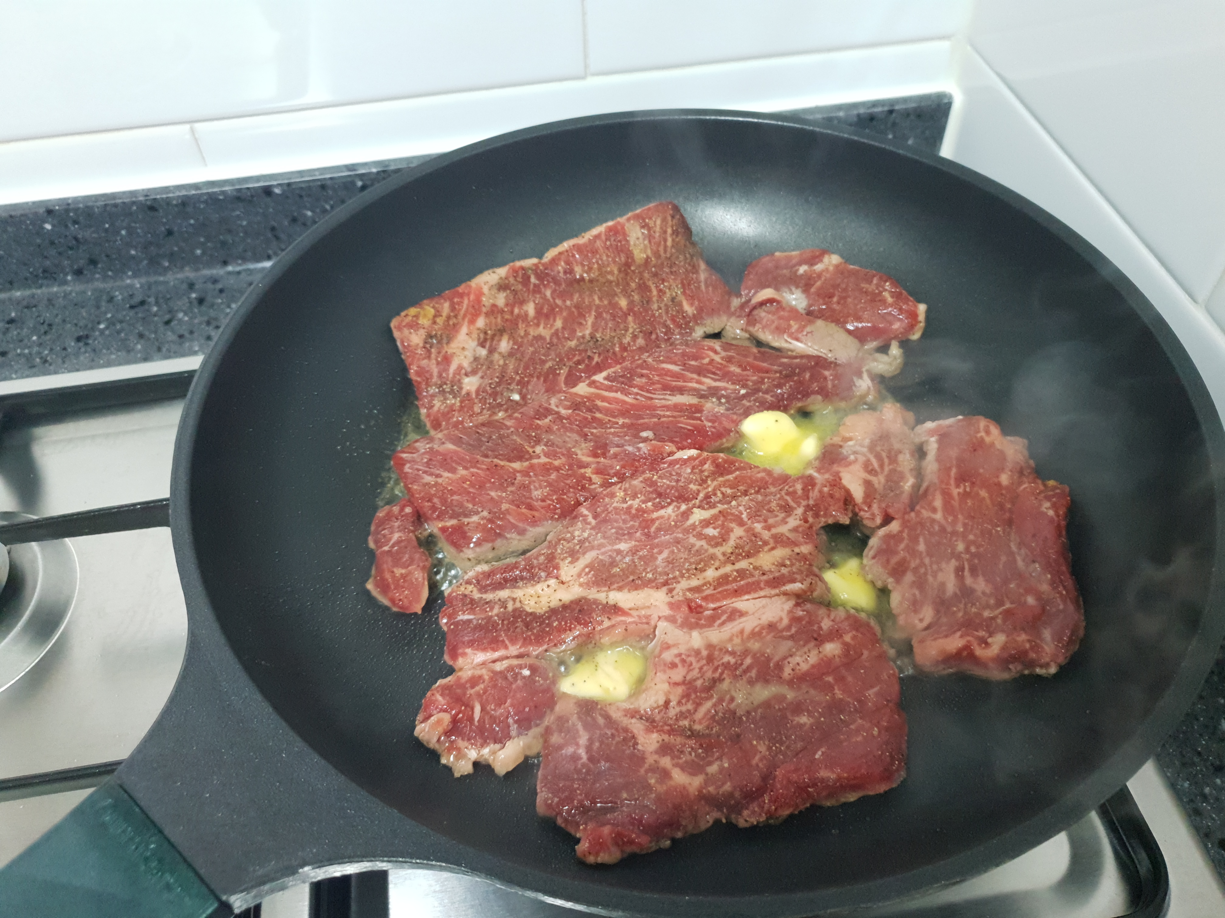 버터도 같이 넣어주면서 소고기를 구워줍니다. 버터까지는 안 넣어도 됩니다만 저는 정말 모든 방법을 총동원하였습니다.