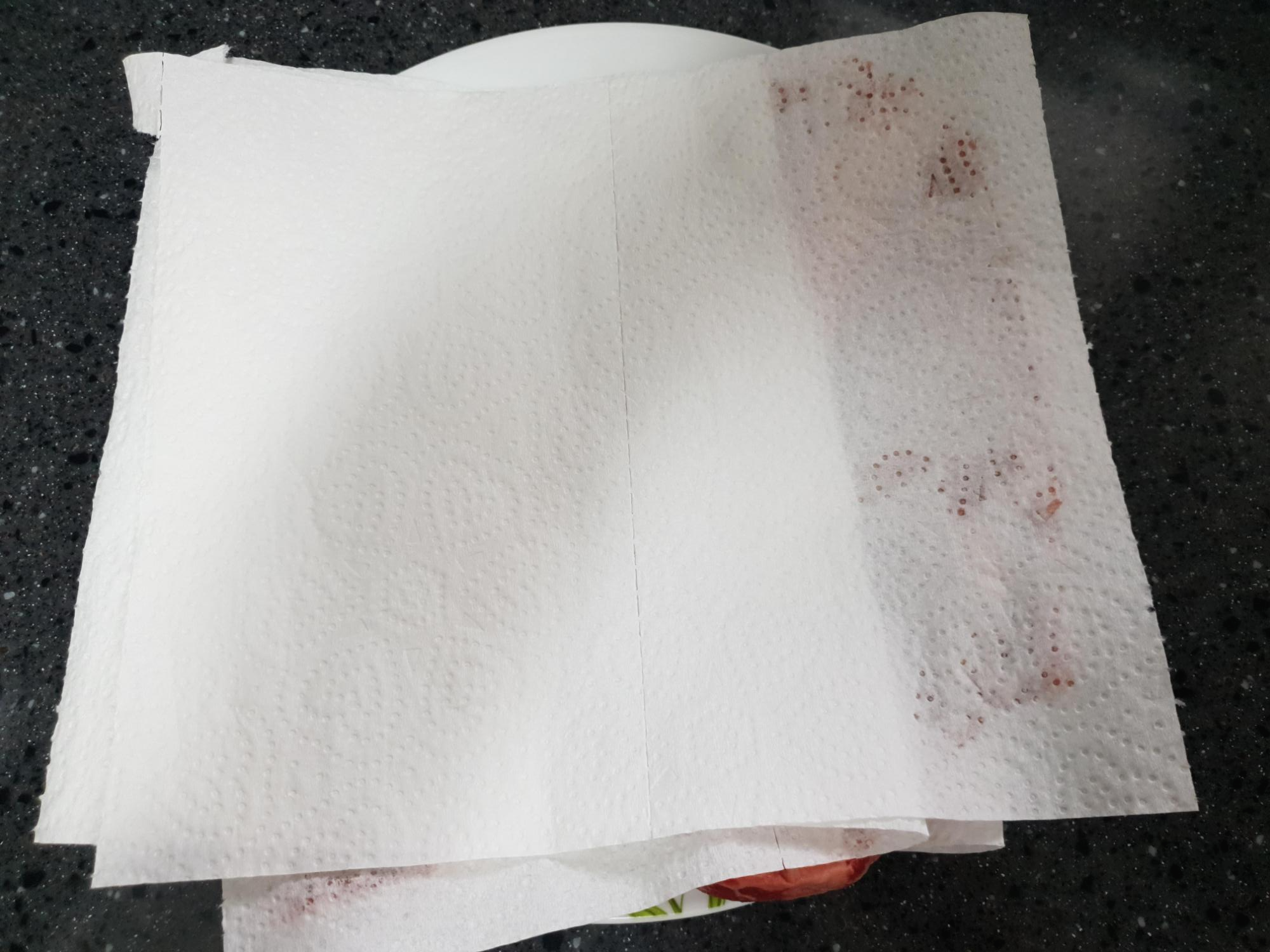 어제 먹고 남은 냉장 소고기를 키친타월을 이용해 핏기를 제거하였습니다. 30분간 키친타월에 감싸 냉장고에 보관하였습니다. 핏기가 묻어 나오는 게 보이시죠? 다 프라임 척 아이롤 소고기 비린내의 원인입니다...