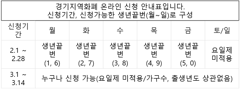경기도 재난기본소득 10만원 온라인 신청기간은 2월 1일 월요일부터 3월 14일 일요일 오전 9시부터 오후 11시까지입니다. 신청방법은 연매출 10억원 이하 매장에서 사용이 가능하며, 출생년도에 따라 요일별 5부제를 적용한다고 하니 위의 표를 확인해주세요.