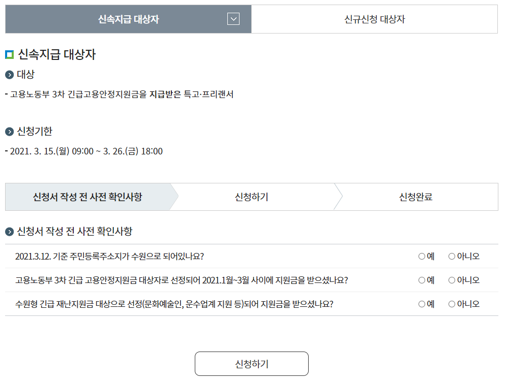 신청서 작성 전 사전 확인사항과 신청기간을 꼭 확인하시기 바랍니다. 확인사항을 완료하셨다면 신청하기를 통해 수원형 긴급 재난지원금 신청을 완료하시면 됩니다.