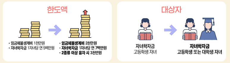 근로자 생활안정자금융자의 소득요건 또한 완화되었고, 상환기간도 5년에서 3년이 늘어난 8년이 되었습니다. 뿐만 아니라 한도액 증가와 자녀학자금 혜택도 고등학생 자녀에서 대학생 자녀까지 포함됩니다.