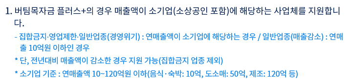 소상공인 버팀목자금 플러스는 4차 재난지원금의 명목으로 매출액이 소기업에 해당하는 사업체에게 지원하는 제도입니다. 집합금지, 영업제한, 일반업종의 경영위기를 겪은 연매출액이 소기업이며 연매출 10억원 이하일 경우 가능합니다. 소기업 기준은 연매출액 10~120억원 이하의 음식, 숙박, 도소매, 제조 등에 포함되는 사업체를 말합니다.