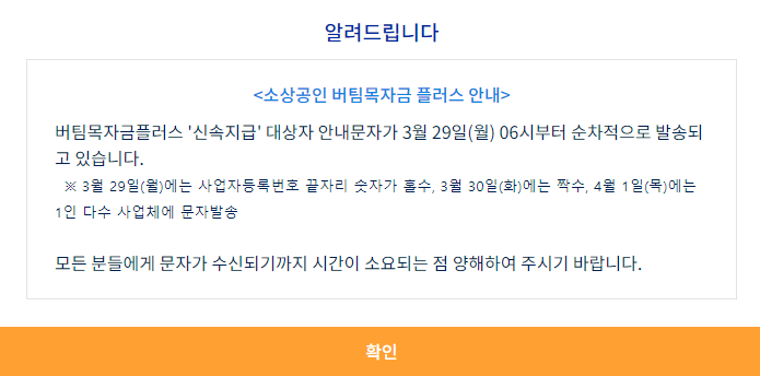 이번 소상공인 버팀목자금 플러스는 3월 29일 월요일에는 사업자등록번호 끝자리가 홀수, 3월 30일 화요일에는 짝수, 4월 1일 목요일에는 1인 다수 사업체에 문자발송이 됩니다.