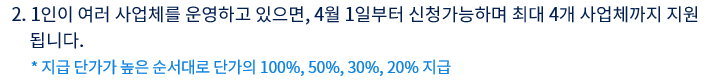 1인이 여러 사업체를 운영하고 있으면, 4월 1일부터 신청이 가능하며 최대 4개의 사업체까지 지원이 됩니다. 지급 단가가 높은 순서대로 단가의 100~20%까지 지급한다고 하니 꼭 신청하시기 바랍니다. 이외에도 특수형태근로종사자도 알아보시면 좋습니다.
