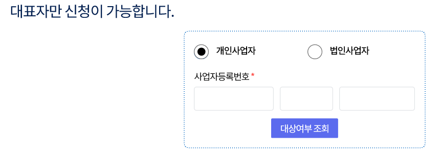 다음으로 넘어가면 소상공인 버팀목자금 플러스 신청란에 대표자만 신청이 가능하다고 나옵니다. 개인사업자와 법인사업자 중 본인이 포함되는 곳에 체크하시고 사업자등록번호를 입력하여 대상여부를 조회해주세요. 본인 확인 방법은 공동인증서는 개인과 법인 모두 가능하며, 휴대폰본인확인은 개인사업자만 가능합니다. 확인이 끝나면 아래의 홈페이지를 방문하시어 신청을 하시면 됩니다.