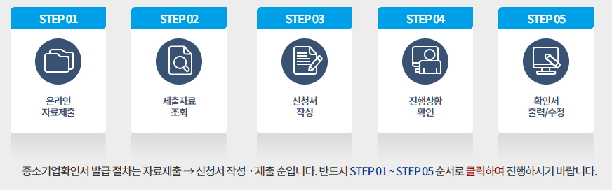 중소기업 확인서를 발급 받기 위해서 STEP01~STEP05 순서로 진행해주시면 됩니다.