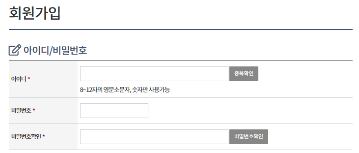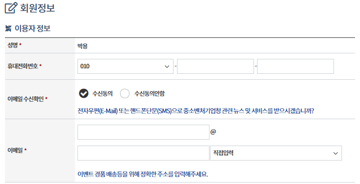 중소기업 확인서 발급을 위해 빨간 별표의 필수사항을 모두 입력 후 회원가입을 해 주시면 됩니다.