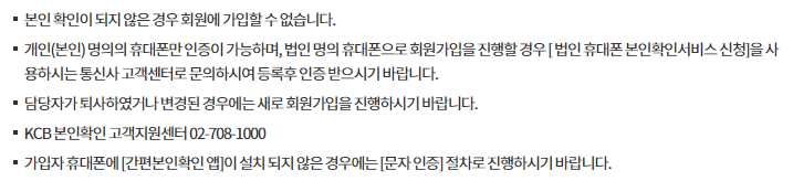 개인 명의의 휴대폰만 가능하며, 법인 명의 휴대폰은 고객센터로 문의하시어 등록 후 인증을 받으셔야 합니다.
