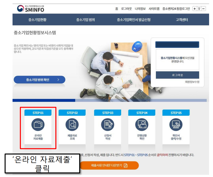 중소기업 확인서를 발급 받기 위해서 STEP01~STEP05 순서로 진행해주시면 됩니다.