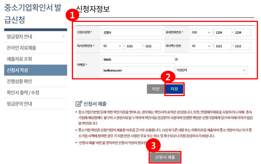 마지막으로 중소기업 확인서 발급 신청자 정보를 입력 후 저장해주세요. 틀린 정보가 없다면 신청서 제출을 하여 중소기업 확인서 발급을 받습니다.