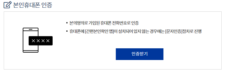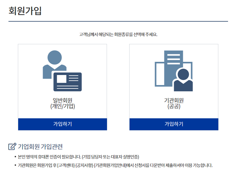 본인명의의 휴대폰 인증이 필요하므로 개인 or 기업을 선택하여 휴대폰 인증을 반드시 하시기 바랍니다.