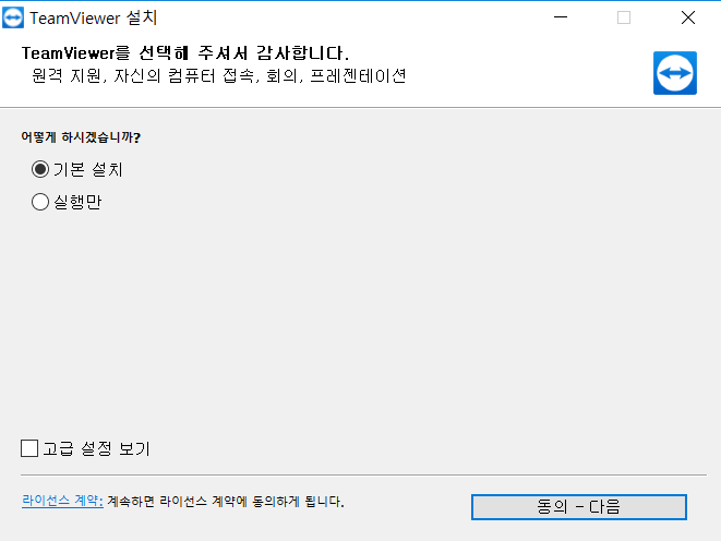팀뷰어 기본설치를 클릭해 주시고, 동의하고 다음을 눌러주세요.