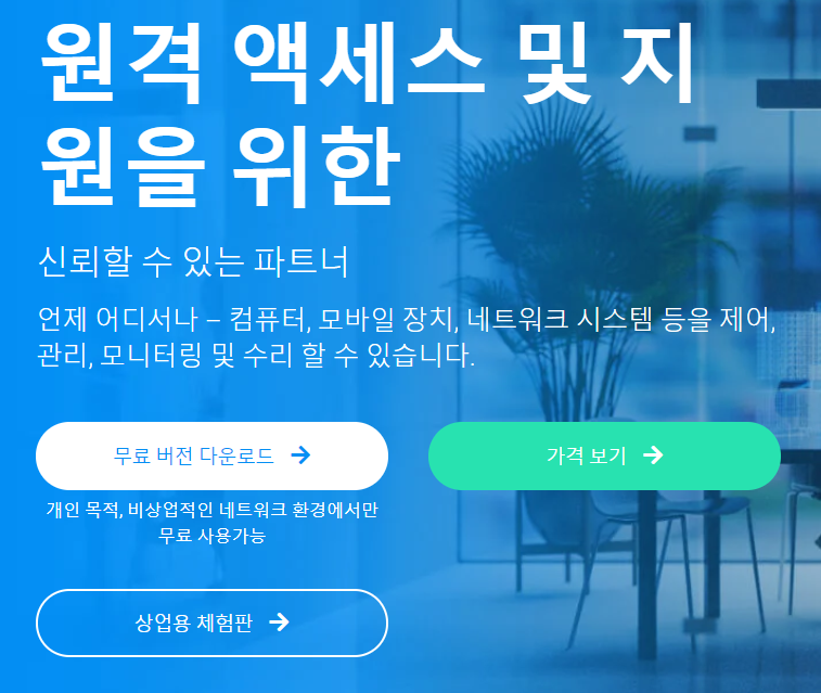 이러한 팀뷰어는 무료 다운로드가 가능합니다. 기업은 비용을 지불하여야 하나 TeamViewer 상업용 체험판을 통해 14일 무료로 사용이 가능하니 팀뷰어 체험판 무료 다운로드를 이용하시기 바랍니다.