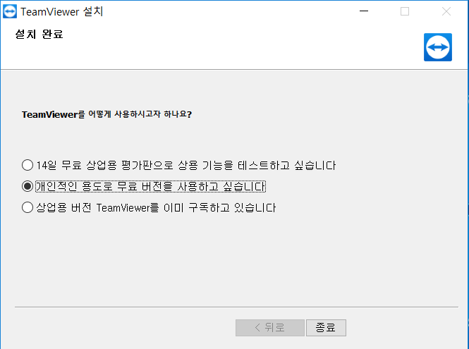 TeamViewer 개인적인 용도로 무료 버전을 사용하고 싶습니다를 선택해주고 종료를 눌러주세요. 이제 팀뷰어 사용이 가능합니다.