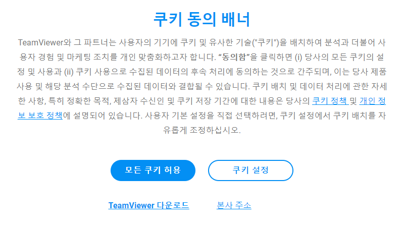 팀뷰어 다운로드 홈페이지에서는 쿠키 동의 배너가 나옵니다. 원하는 설정을 확인하고 TeamViewer 다운로드를 실시해 주시면 됩니다.