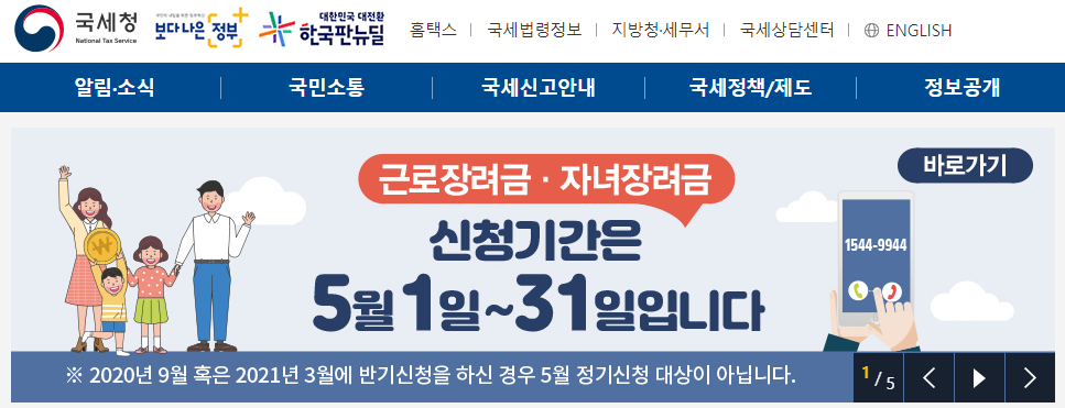 국세청 홈페이지에 들어가시면 자녀장려금 및 근로장려금 바로가기 배너를 볼 수 있습니다. 이를 눌러서 들어가주세요.