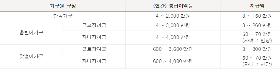 - 가구원 구성에 따라 총소득 부부합산 금액이 기준금액에 만족