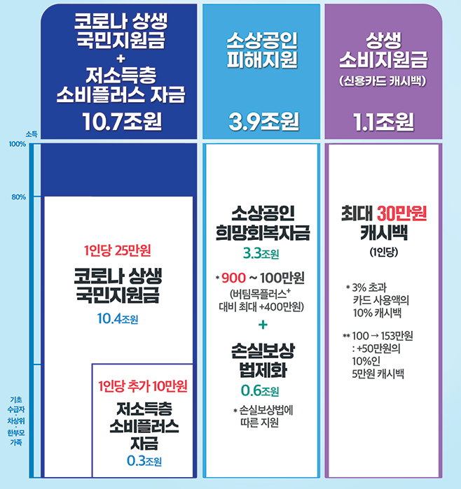 코로나19 피해지원 3종 패키지는 5차 재난지원금 지급에 포함됩니다. 코로나 상생 국민지원금 및 저소득층 소비플러스 자금에 10.7조원, 소상공인 피해지원에 3.9조원, 상생 소비지원금은 신용카드 캐시백을 통해 1.1조원이 지급됩니다. 코로나 상생 국민지원금은 1인당 25만원, 자소득층 소비플러스 자금은 1인당 추가 10만원을 더 지급하며, 소상공인 희망회복자금은 900~100만원을 차등 지급합니다. 만약 소상공인 향후 피해가 생길 경우에는 손실보상 법제화를 통해 추가적인 지급이 가능합니다. 이외에도 상생소비지원금의 목적으로 1인당 최대 30만원 캐시백이 된다는 점 참고하시기 바랍니다.